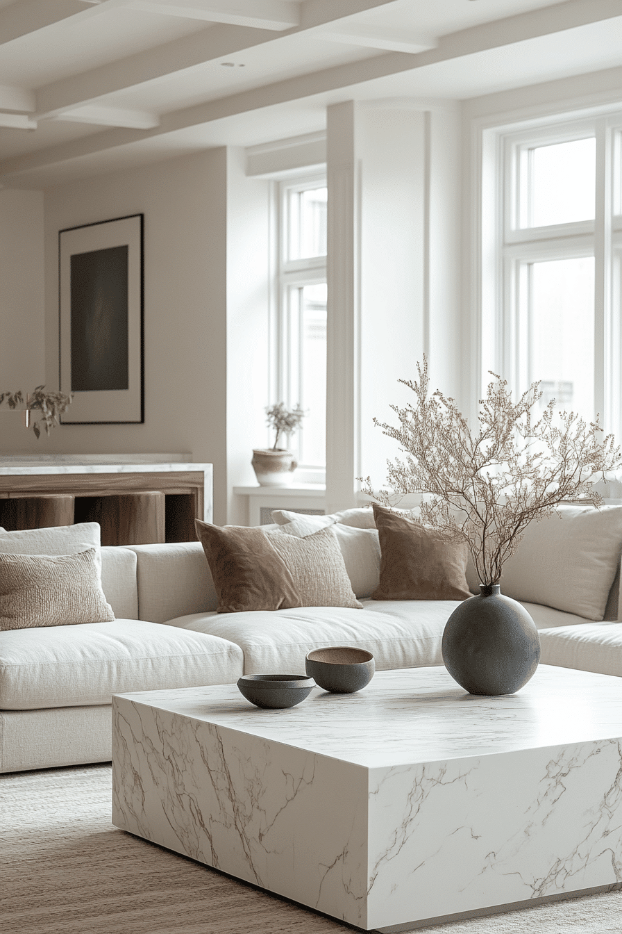 High-end materials elevate a minimalist living room while preserving its clean and simple aesthetic. Marble surfaces, soft fabrics, and refined finishes add luxury. The design focuses on quality over quantity. This minimalist living room feels polished and intentional. Every detail enhances the overall look. Explore more luxury minimalist living room inspiration.
