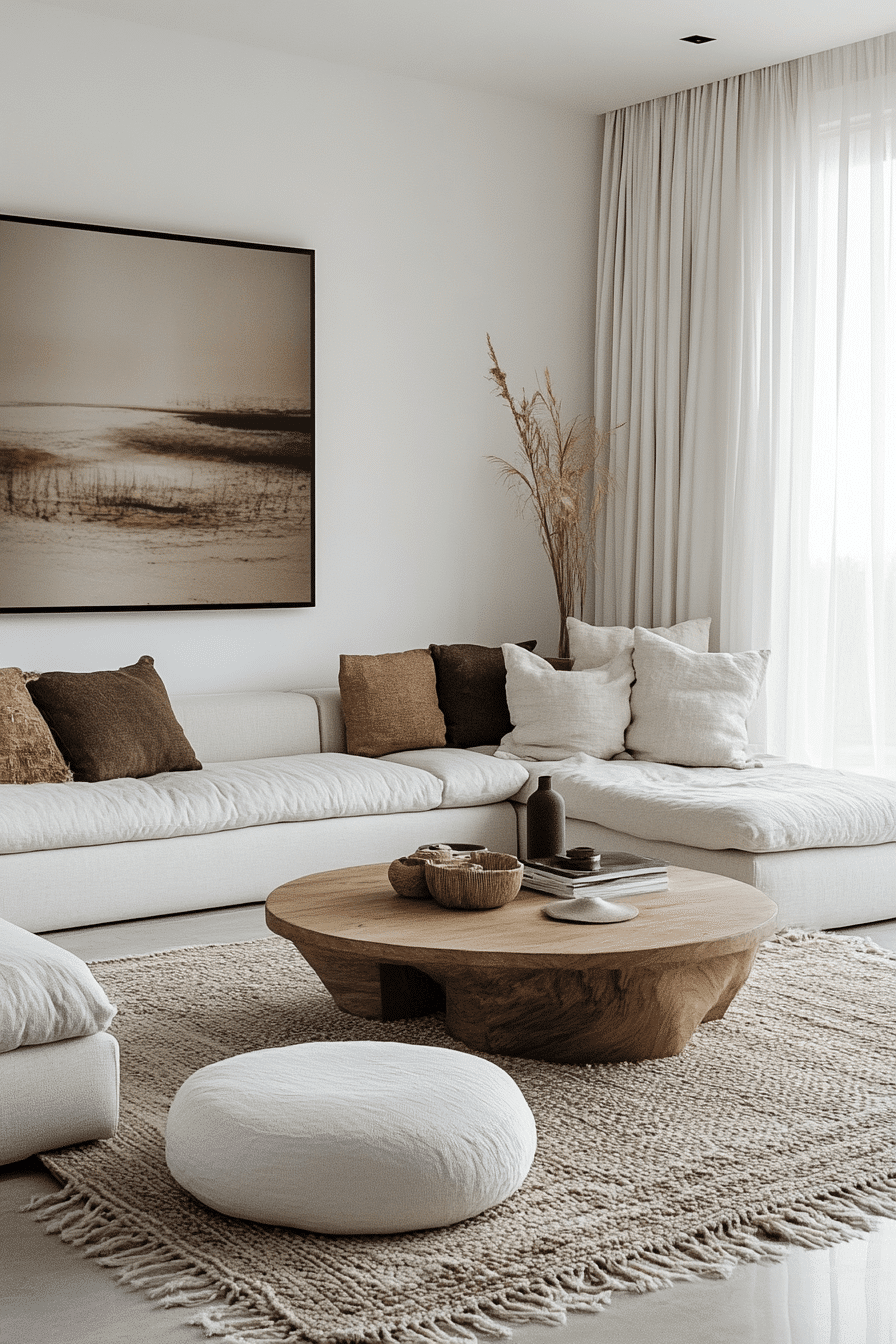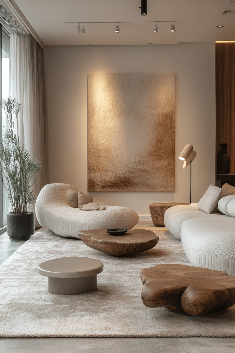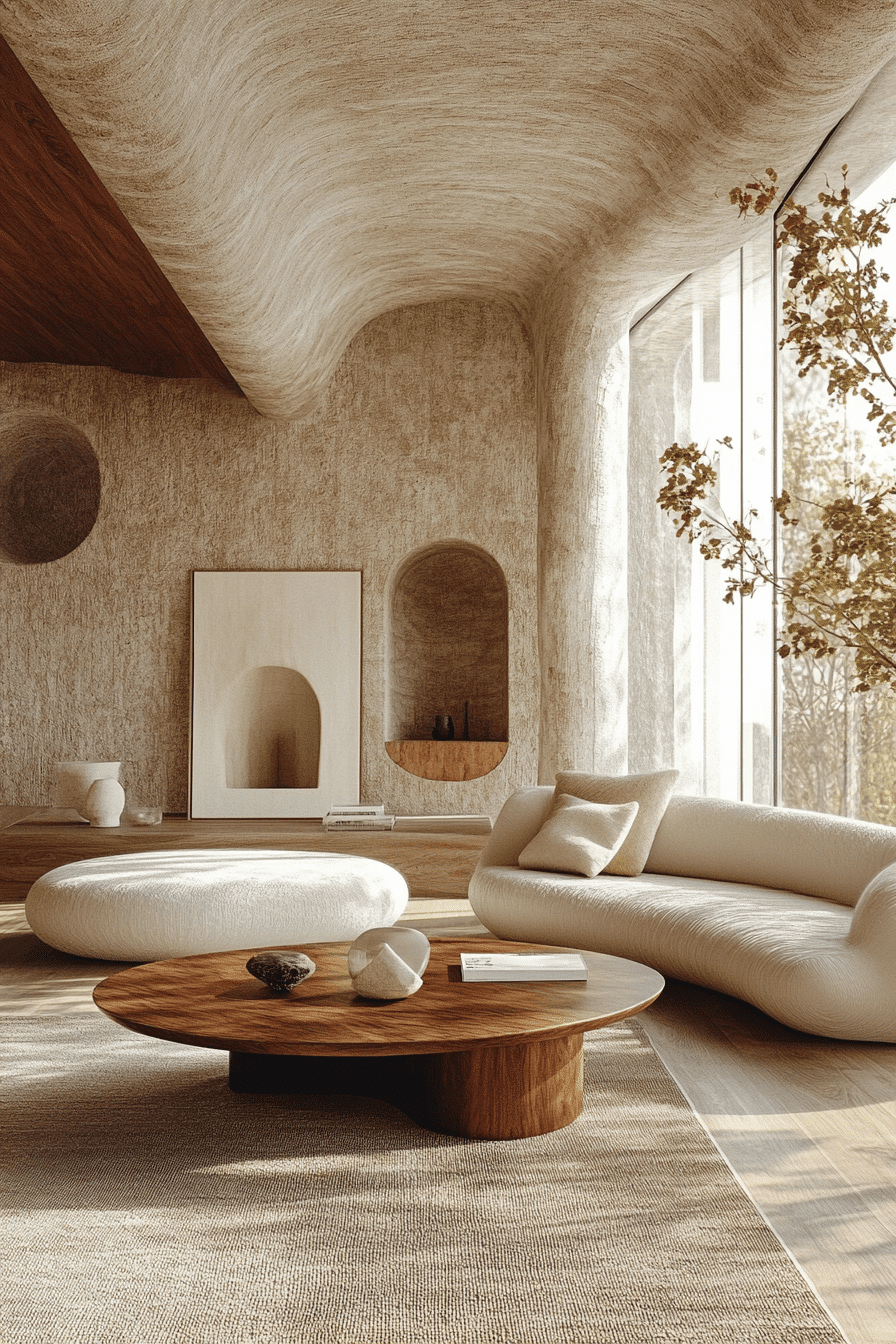 Smooth curves introduce a gentle flow into a minimalist living room, softening the overall look while keeping it modern. Rounded seating and circular accents create a welcoming feel. Neutral tones highlight the shapes without overwhelming the space. This minimalist living room feels balanced and inviting. Layout naturally supports relaxation and conversation. Discover more curved minimalist living room inspiration to love.