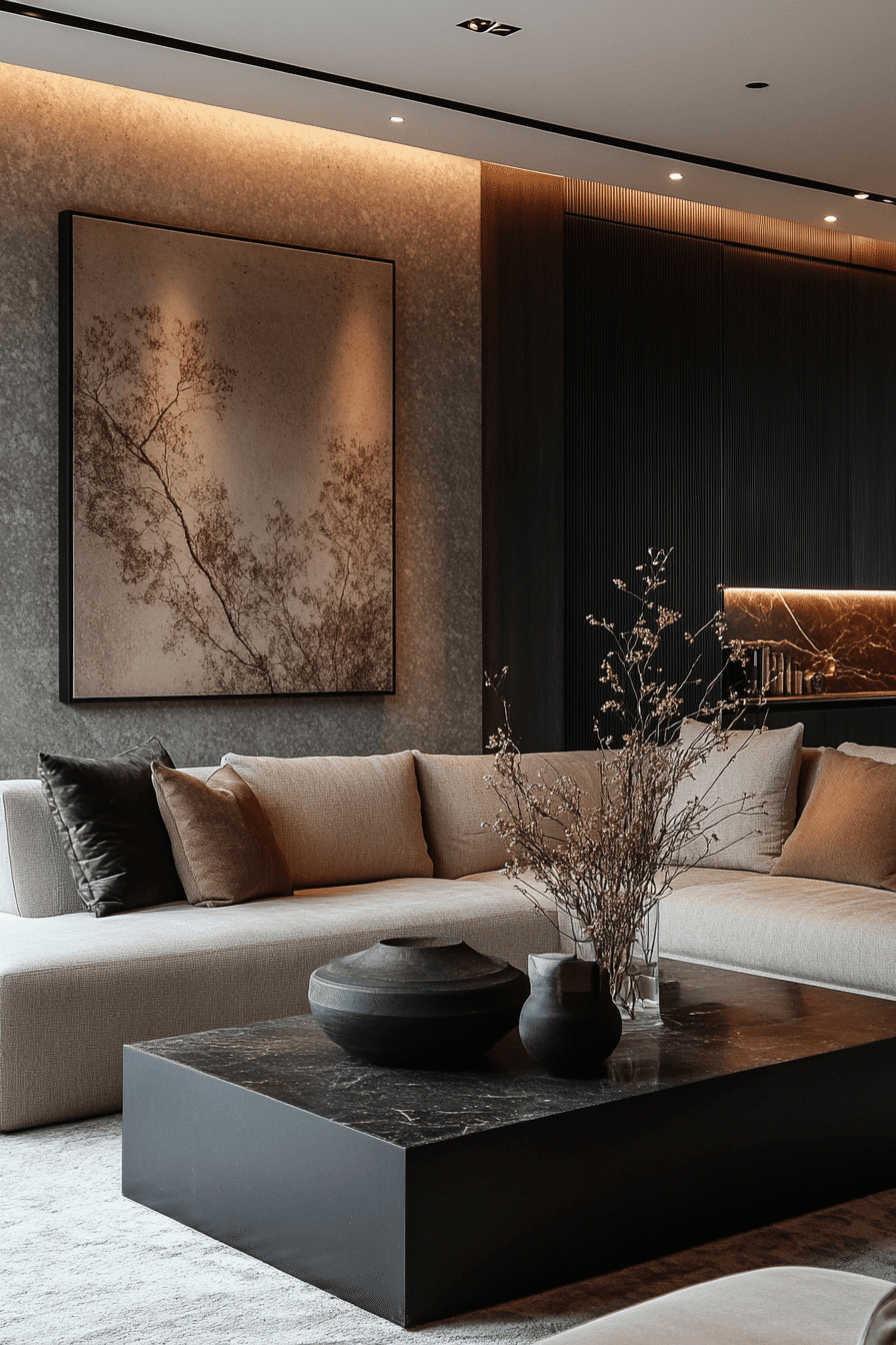Black and beige tones create a minimalist living room that blends bold contrast with soft warmth. Dark accents add depth while lighter tones soften the look. Clean furniture ties everything together. This minimalist living room feels refined and approachable. Subtle textures enhance balance. Discover more black and beige minimalist living room ideas.