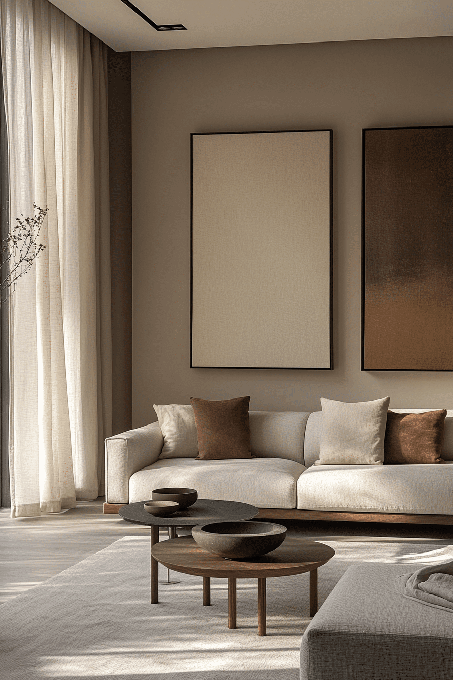 Earthy taupe and stone hues bring grounded elegance into a minimalist living room with a natural touch. Warm and cool tones blend seamlessly for balance. Simple furniture keeps the look uncluttered. This minimalist living room feels timeless and sophisticated. Subtle textures add richness without distraction. Explore more taupe and stone minimalist living room inspiration.