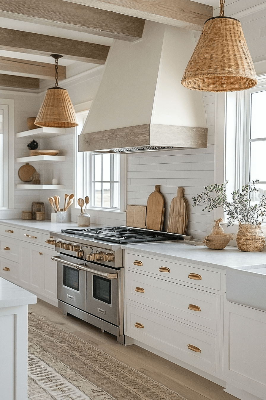 White cabinetry paired with pale wood details gives this modern coastal kitchen a fresh, sand-inspired look. The palette feels light, neutral, and endlessly versatile. Natural flooring enhances warmth without visual weight. Brass hardware adds a soft glow throughout the space.