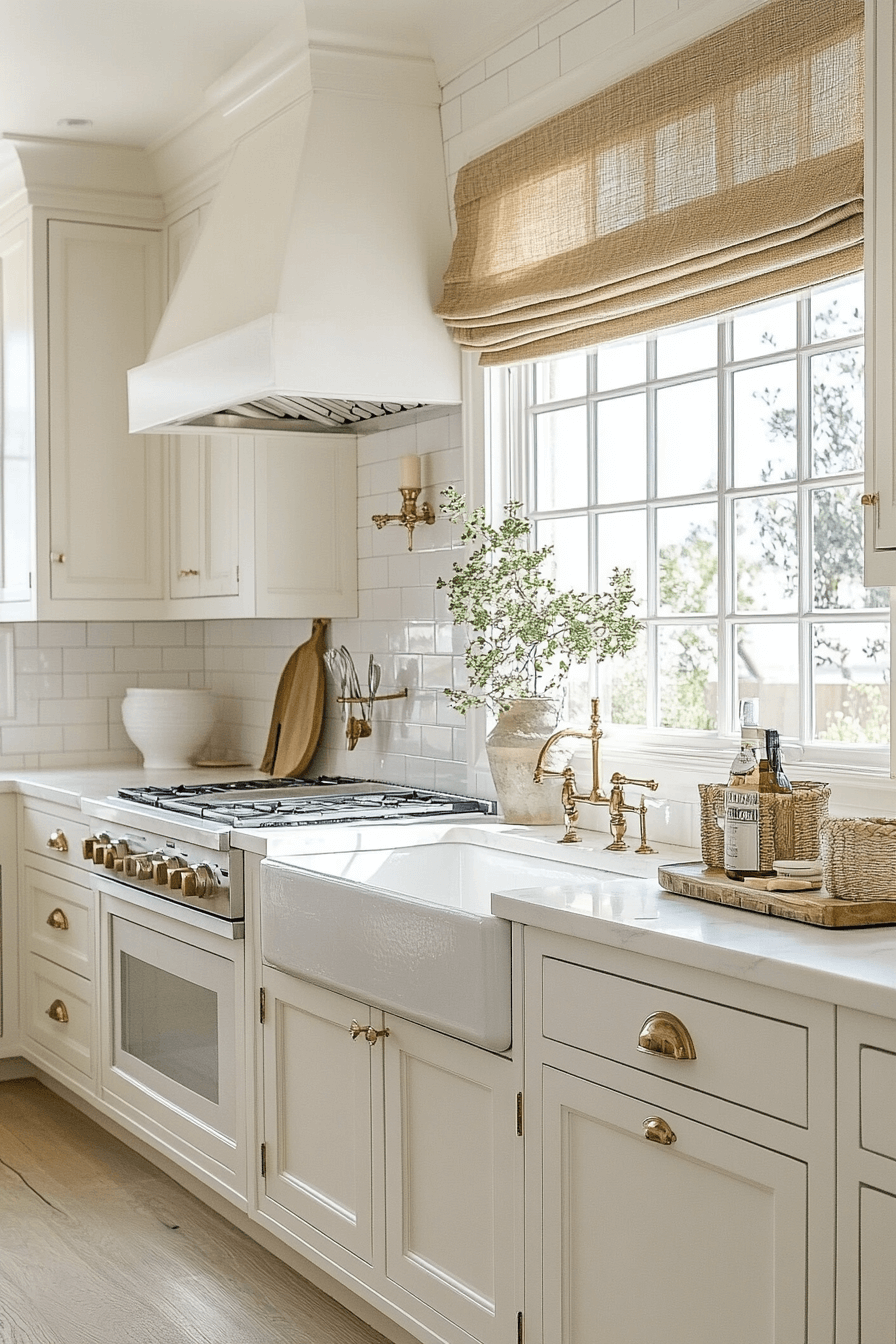 Soft neutrals anchor a modern coastal kitchen designed to feel airy and welcoming. Warm whites, beige tones, and greige finishes layer together for effortless harmony. Shaker cabinetry and brushed metal details add subtle sophistication. Natural light enhances every surface and softens the palette beautifully.