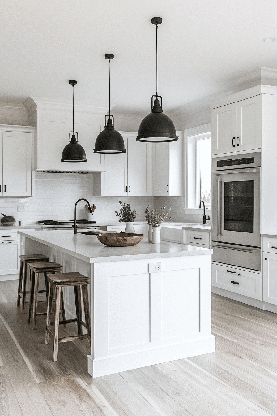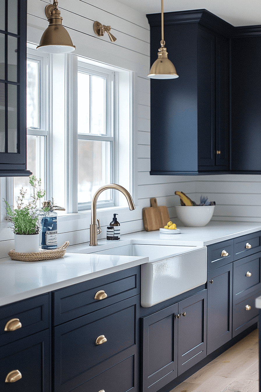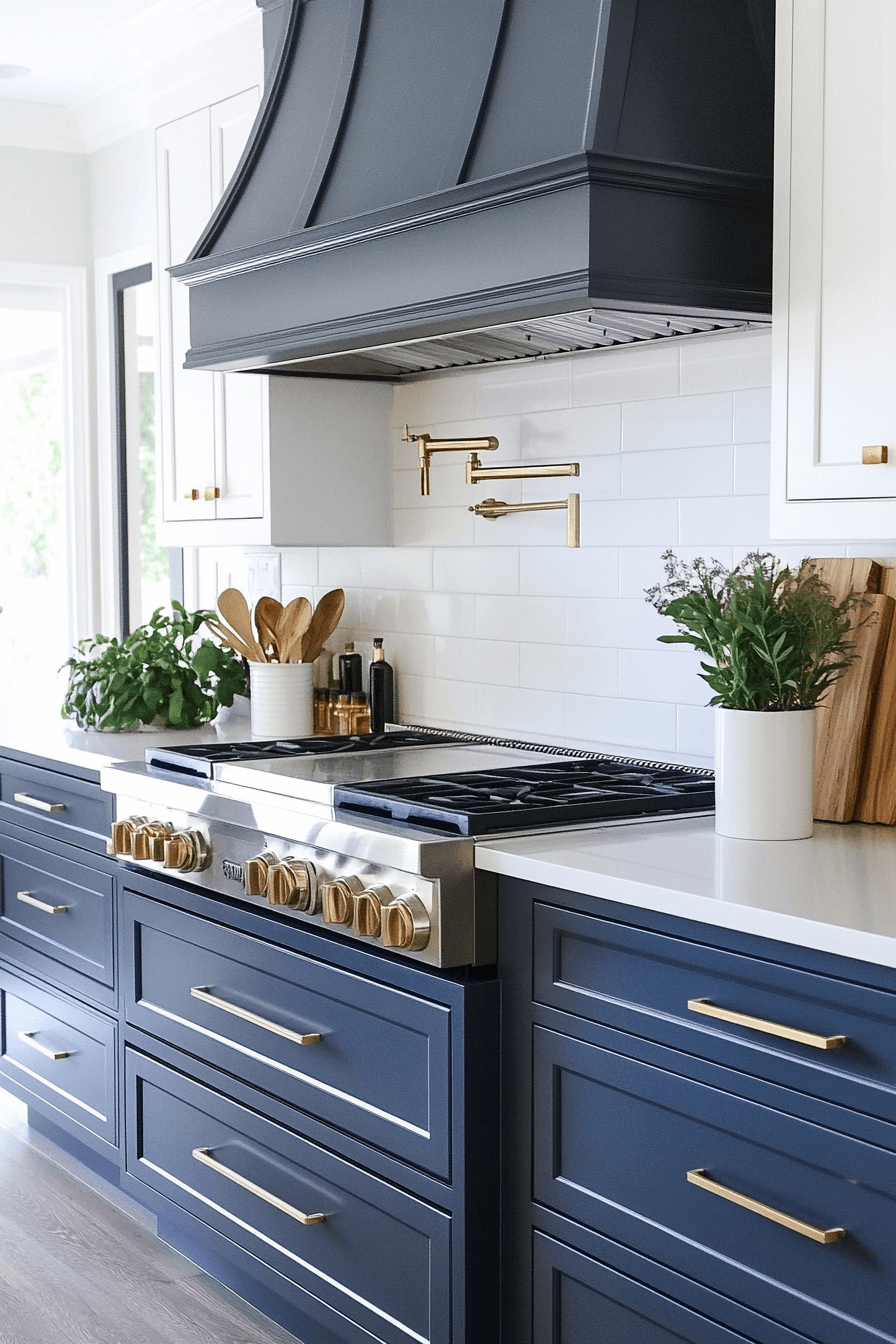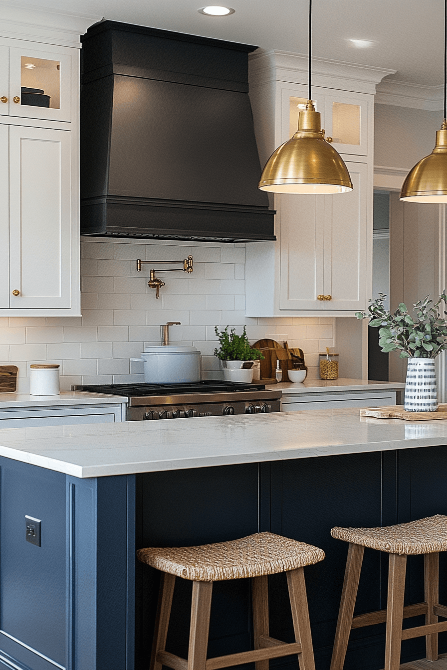 Bold contrast defines this modern coastal kitchen through deep navy lowers and bright white uppers. Stone countertops introduce elegance while dark hardware sharpens the look. Natural wood flooring softens the contrast and adds warmth. Soft lighting keeps the space inviting rather than dramatic.