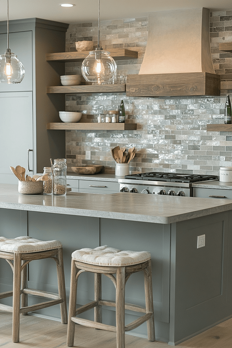 Pebble-inspired textures bring gentle elegance to a modern coastal kitchen. Soft grays, rounded hardware, and matte finishes echo shoreline elements. Textured tile adds depth while remaining understated. Natural lighting enhances the organic palette.