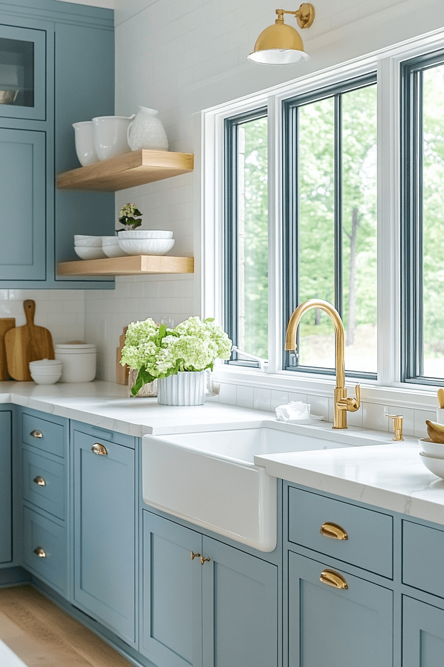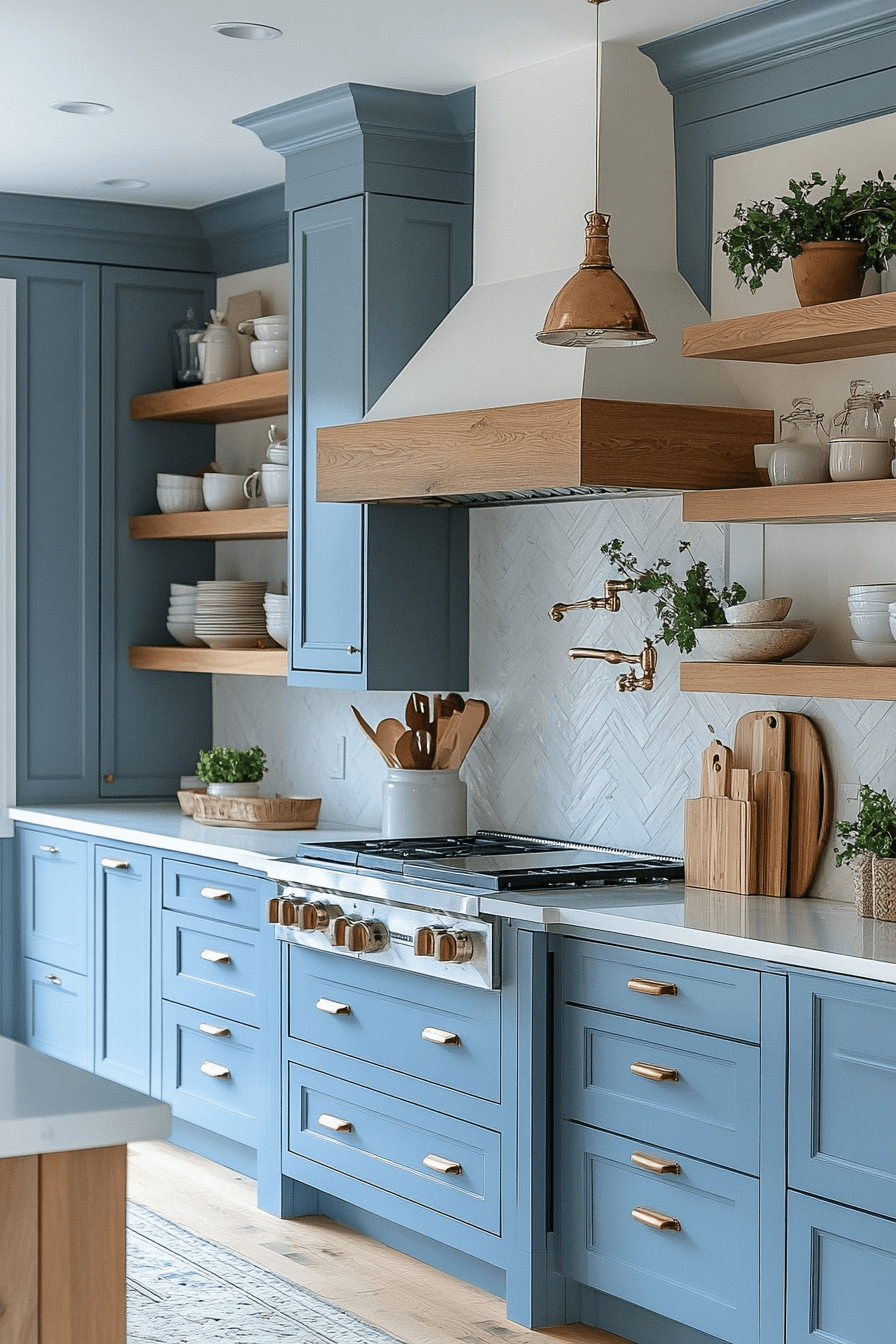 Soft blue cabinetry paired with birch wood accents gives this modern coastal kitchen a fresh, contemporary feel. The cool-warm contrast adds visual interest without overpowering the space. Clean lines and simple fixtures maintain a minimalist look. White walls allow the tones to stand out.
