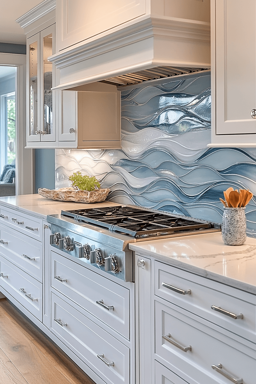 Wave-inspired patterns introduce graceful movement into this modern coastal kitchen. Curved elements and layered blue tones echo the rhythm of the ocean. Neutral cabinetry provides grounding balance and keeps the look refined. Soft lighting enhances the flowing design.