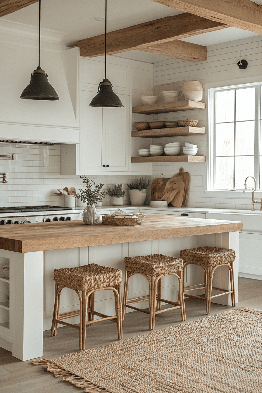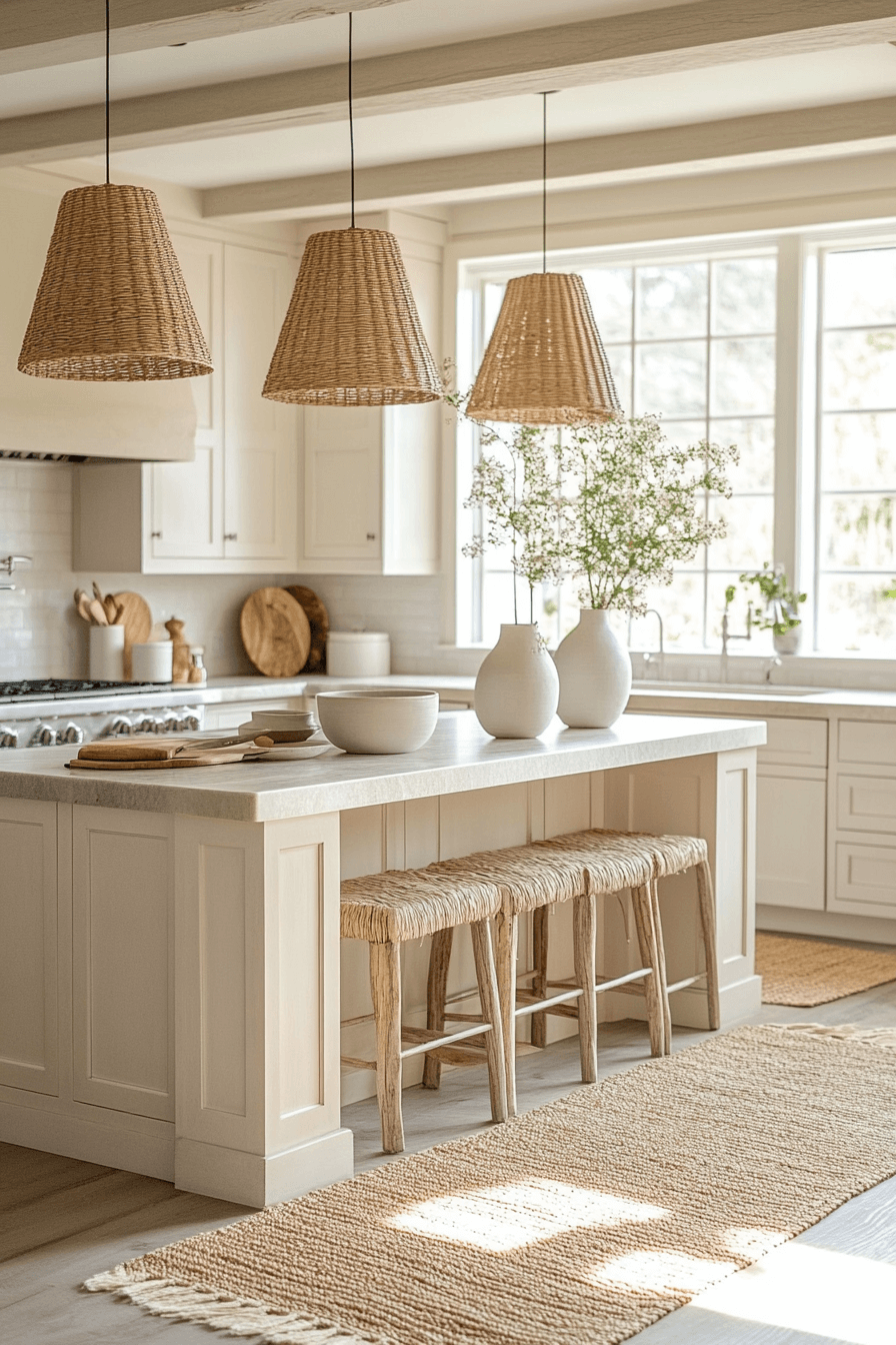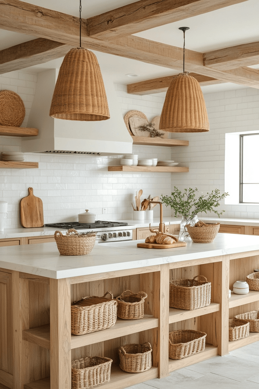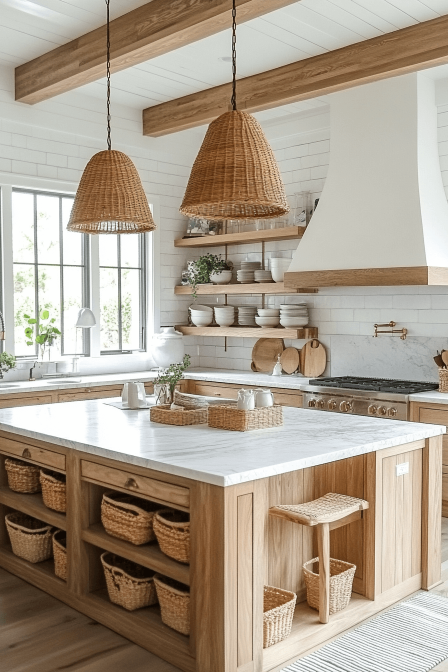 Warm wood tones and sandy hues give this modern coastal kitchen a sunlit, welcoming feel. Rattan seating and open shelving emphasize relaxed coastal charm. Cream-colored walls keep the space bright and breathable. Subtle beige and taupe accents add cohesion throughout.