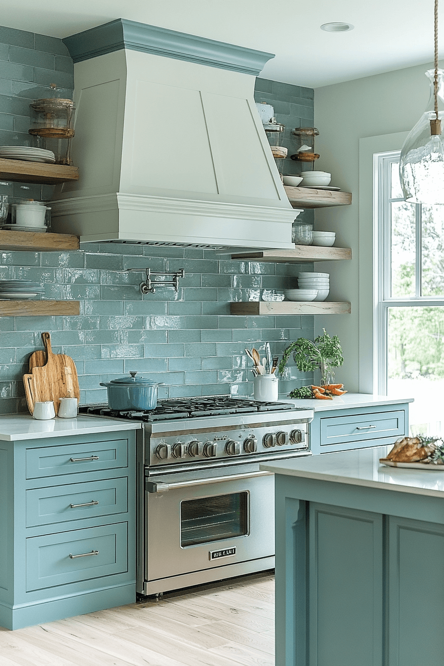 Seafoam green introduces gentle color into a modern coastal kitchen without overpowering the space. Glossy tile and white cabinetry reflect light beautifully throughout the room. The hue feels nostalgic yet fresh, inspired by sea glass tones. Natural wood accents ground the palette for warmth.
