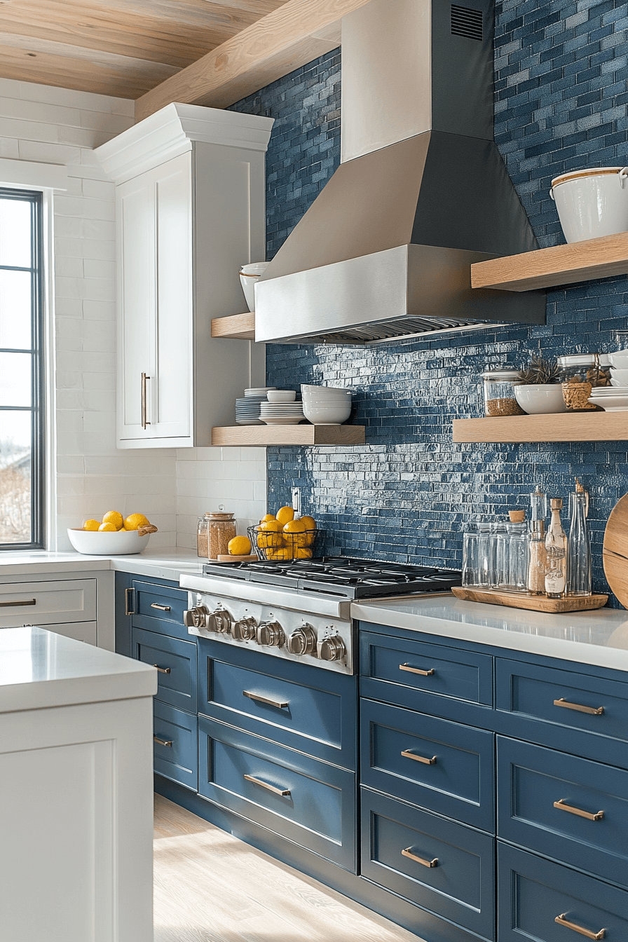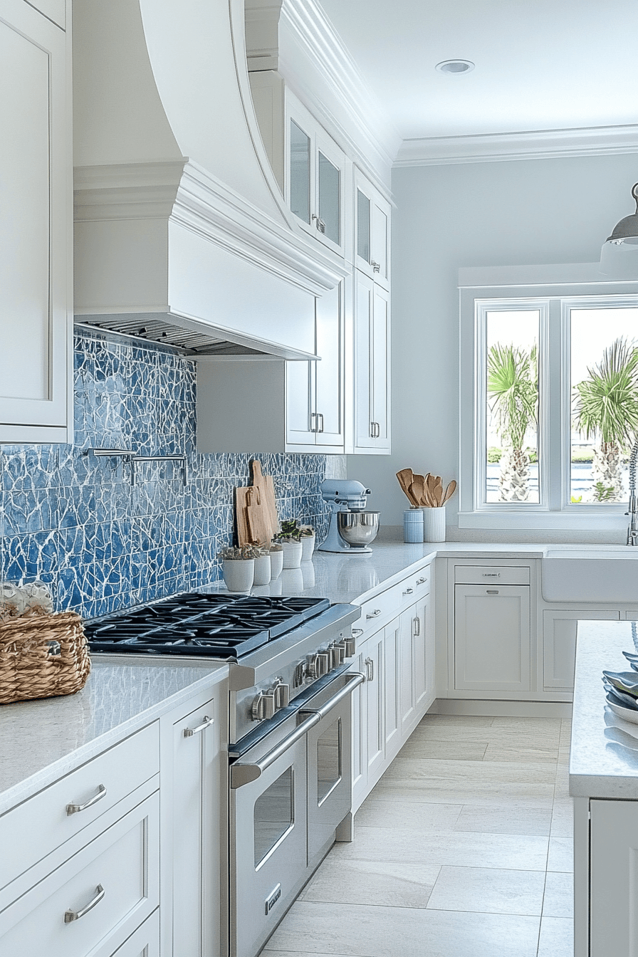 Lagoon blues paired with glossy whites give this modern coastal kitchen vibrant personality. Statement backsplashes draw the eye while stone counters ground the look. Stainless finishes add polish and durability. The space feels fresh, joyful, and ocean-inspired.