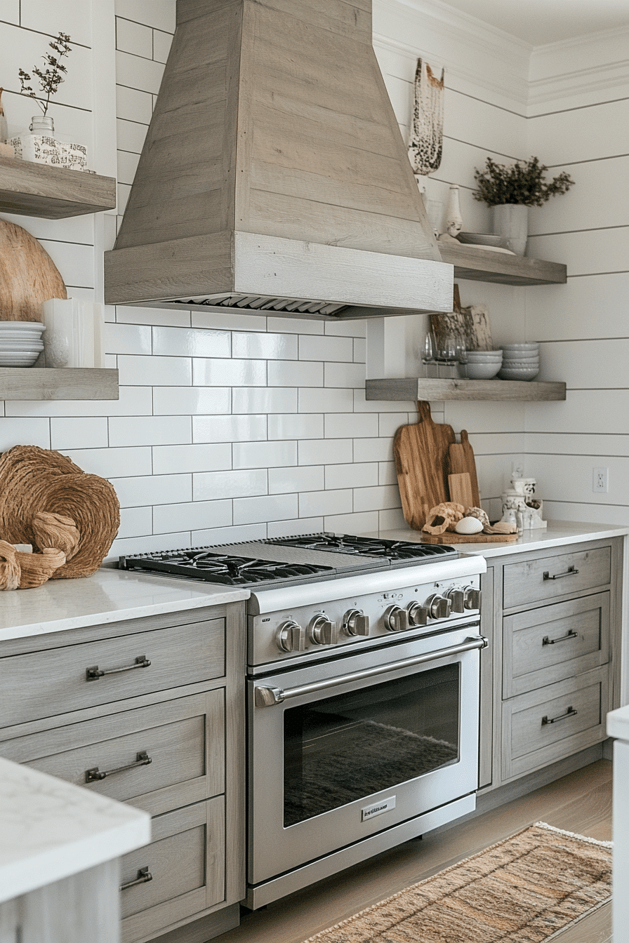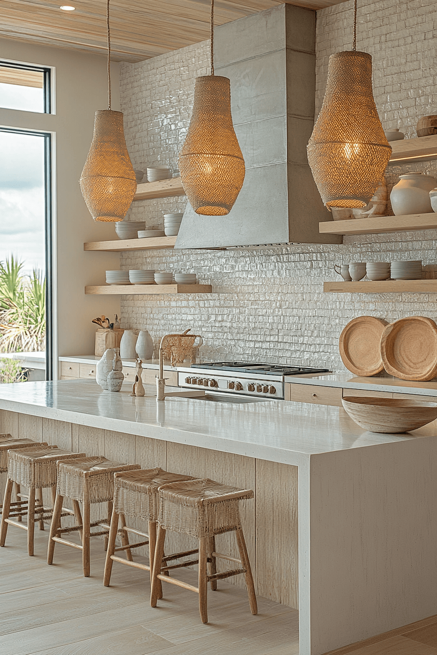 Pale grays and whites create a cloud-soft mood in this modern coastal kitchen. Woven textures introduce warmth and balance. Open shelving keeps the design light and functional. Coastal ceramics add subtle nautical character.