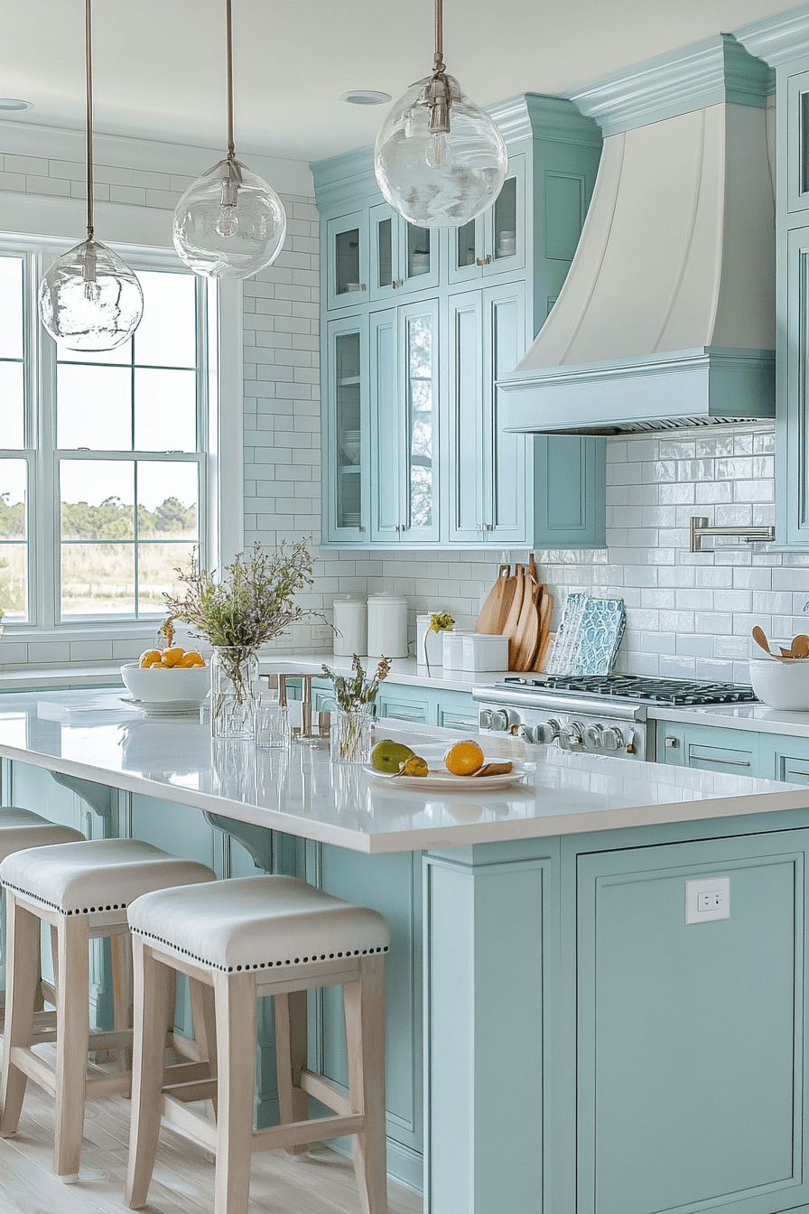 Soft blues, glass accents, and gentle lighting shape a modern coastal kitchen designed for calm living. Smooth surfaces encourage visual flow and simplicity. Pale teal tiles and translucent pendants add subtle depth. Minimal decor allows the palette to breathe.