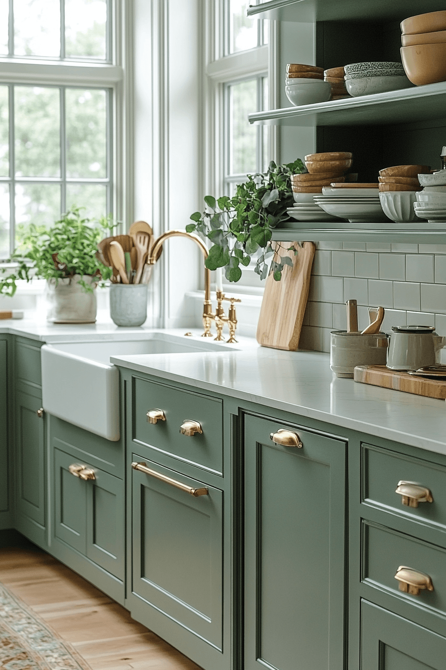 Sea-mist hues bring refreshing calm to this modern coastal kitchen. Soft green-gray cabinetry pairs beautifully with metallic finishes. Coastal details appear sparingly for balance. The palette feels cool and composed.