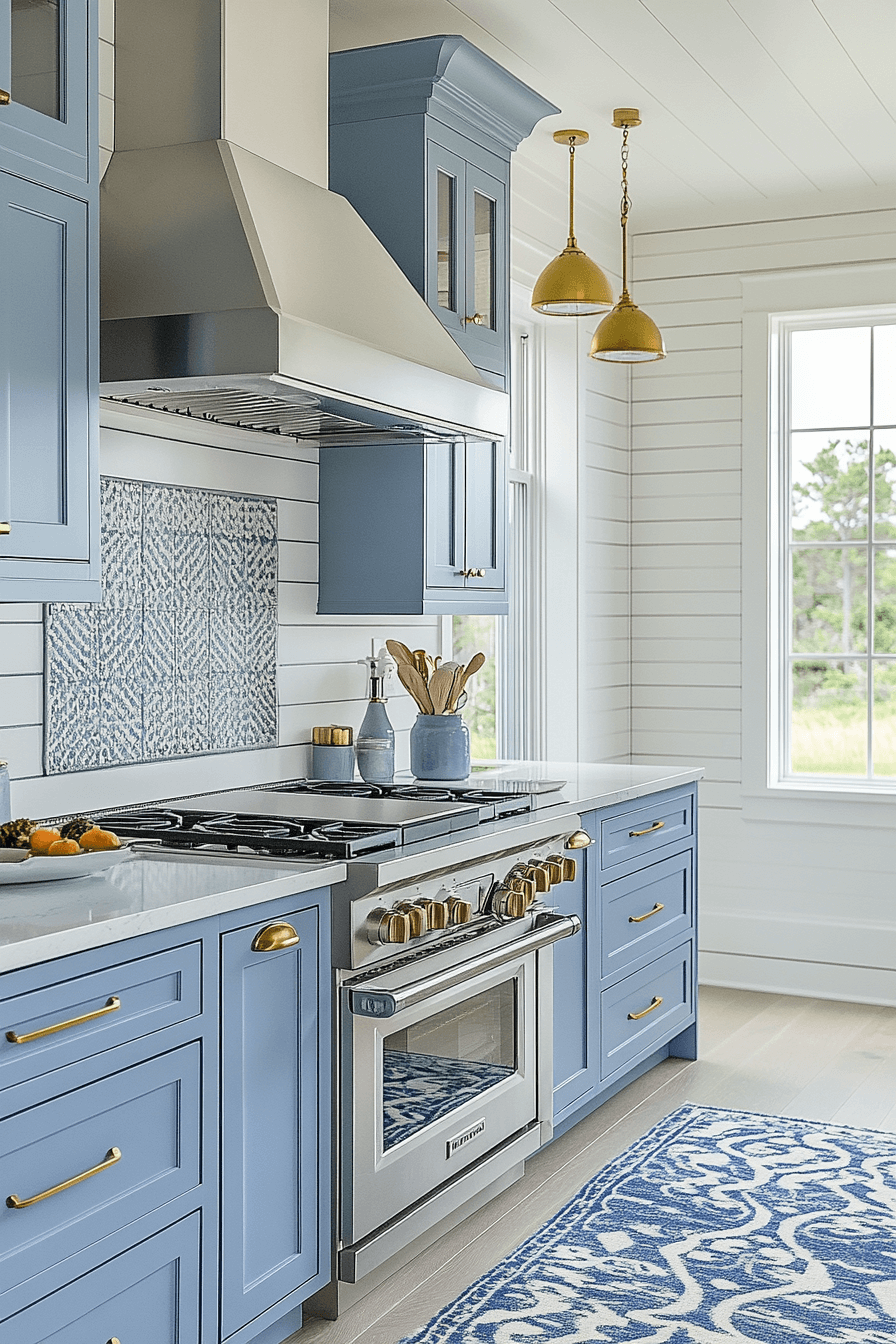 Layered shades of blue create depth and interest in a modern coastal kitchen. Deep base cabinets contrast beautifully with lighter backsplashes and counters. Metallic accents keep the palette bright and balanced. The design feels confident while remaining coastal at heart.