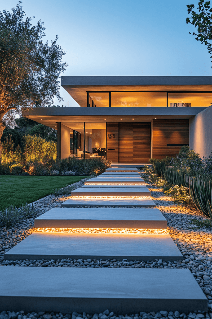 Linear pathways highlight how a modern front yard can feel structured and visually striking. Straight edges guide movement while creating a sense of order. Minimal plantings keep the focus on form and flow. The design feels organized yet inviting. It’s a refined approach to curb appeal. Elevate your layout with more modern front yard outdoor balcony ideas.