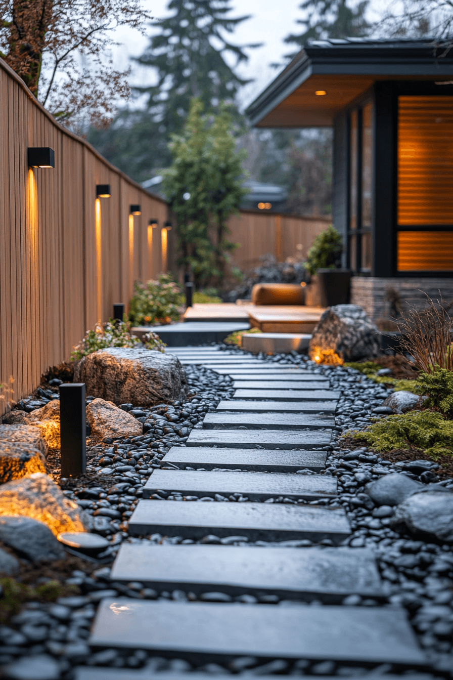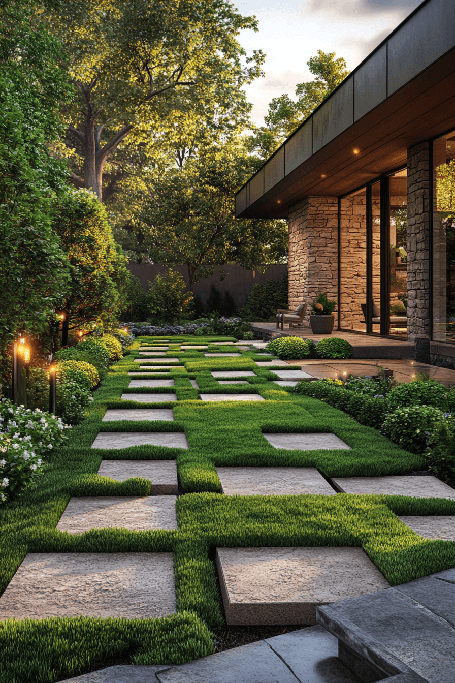 A defined stone walkway demonstrates how a modern front yard can blend function with style. Large pavers create a smooth and grounded path. Clean edges keep the layout sharp and organized. The texture adds subtle visual interest. It’s both practical and visually appealing. Enhance your pathways with more modern front yard outdoor balcony ideas.