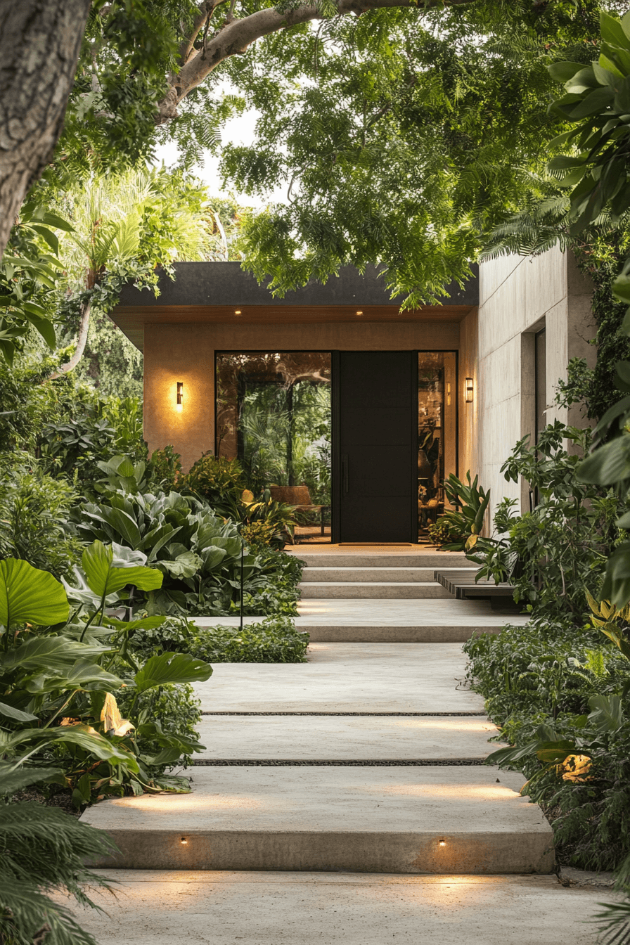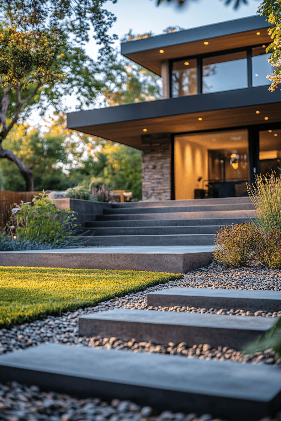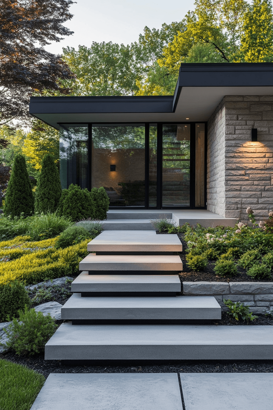 A bold entry layout highlights how a modern front yard can create a strong first impression. Clean steps and sleek materials define the approach. Coordinated elements enhance cohesion. The design blends architecture with landscaping seamlessly. It feels modern and polished. Enhance your entry with more modern front yard outdoor balcony ideas.