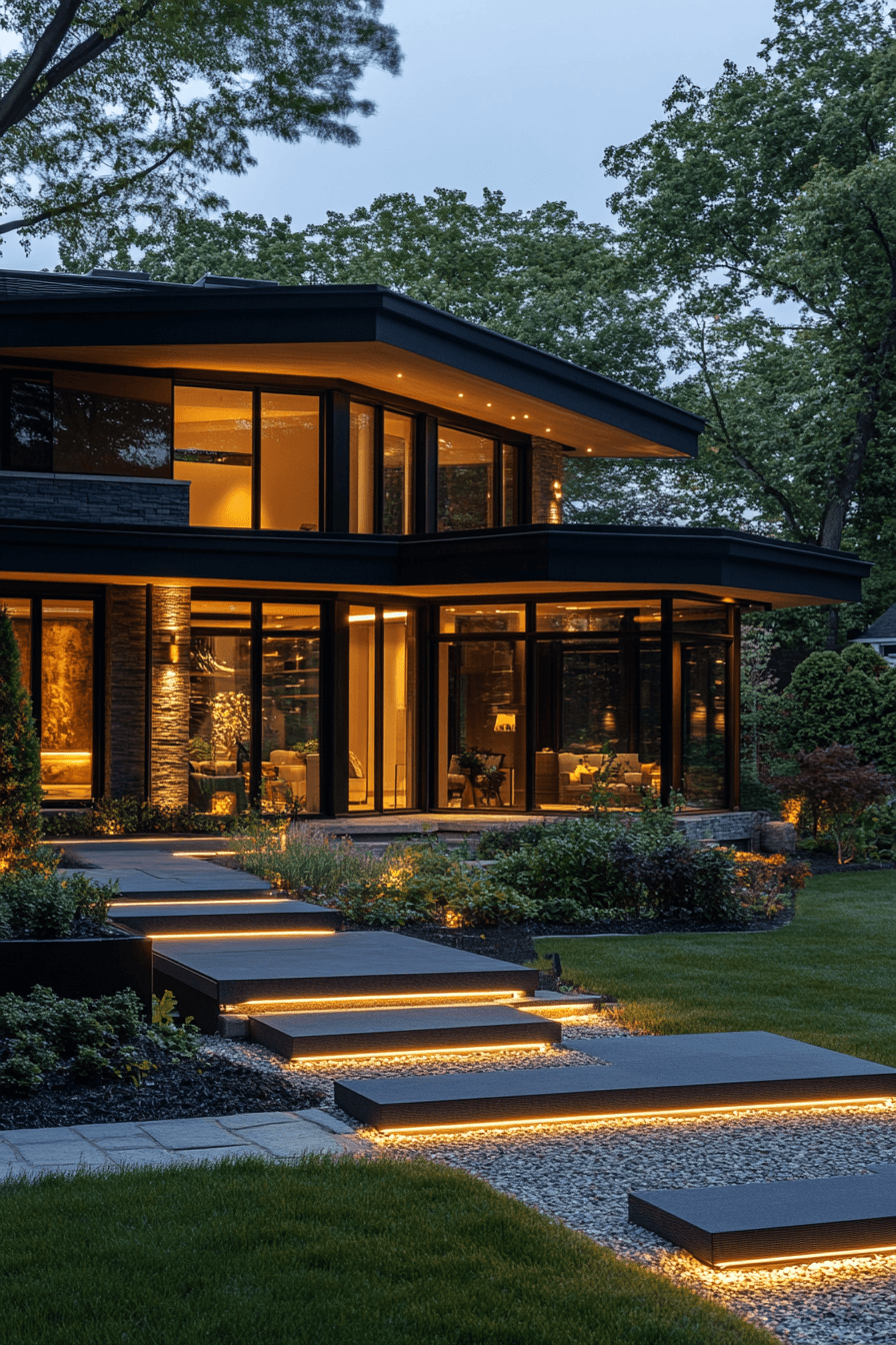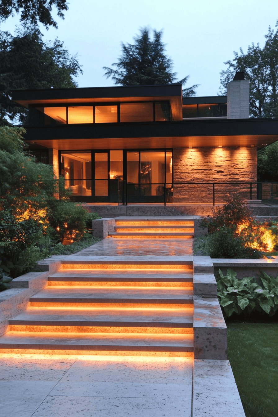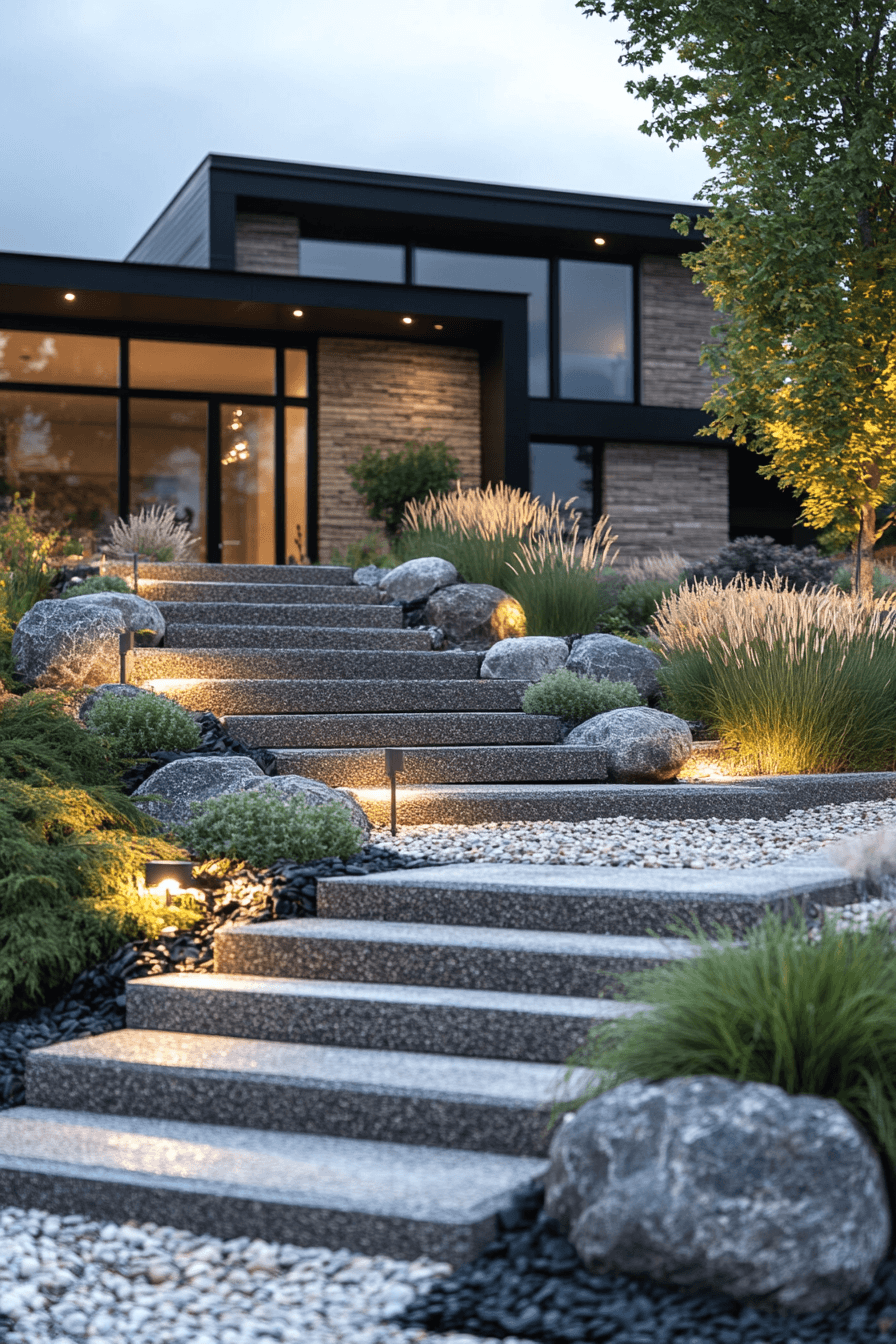 A bold entry layout highlights how a modern front yard can create a strong first impression. Clean steps and sleek materials define the approach. Coordinated elements enhance cohesion. The design blends architecture with landscaping seamlessly. It feels modern and polished. Enhance your entry with more modern front yard outdoor balcony ideas.