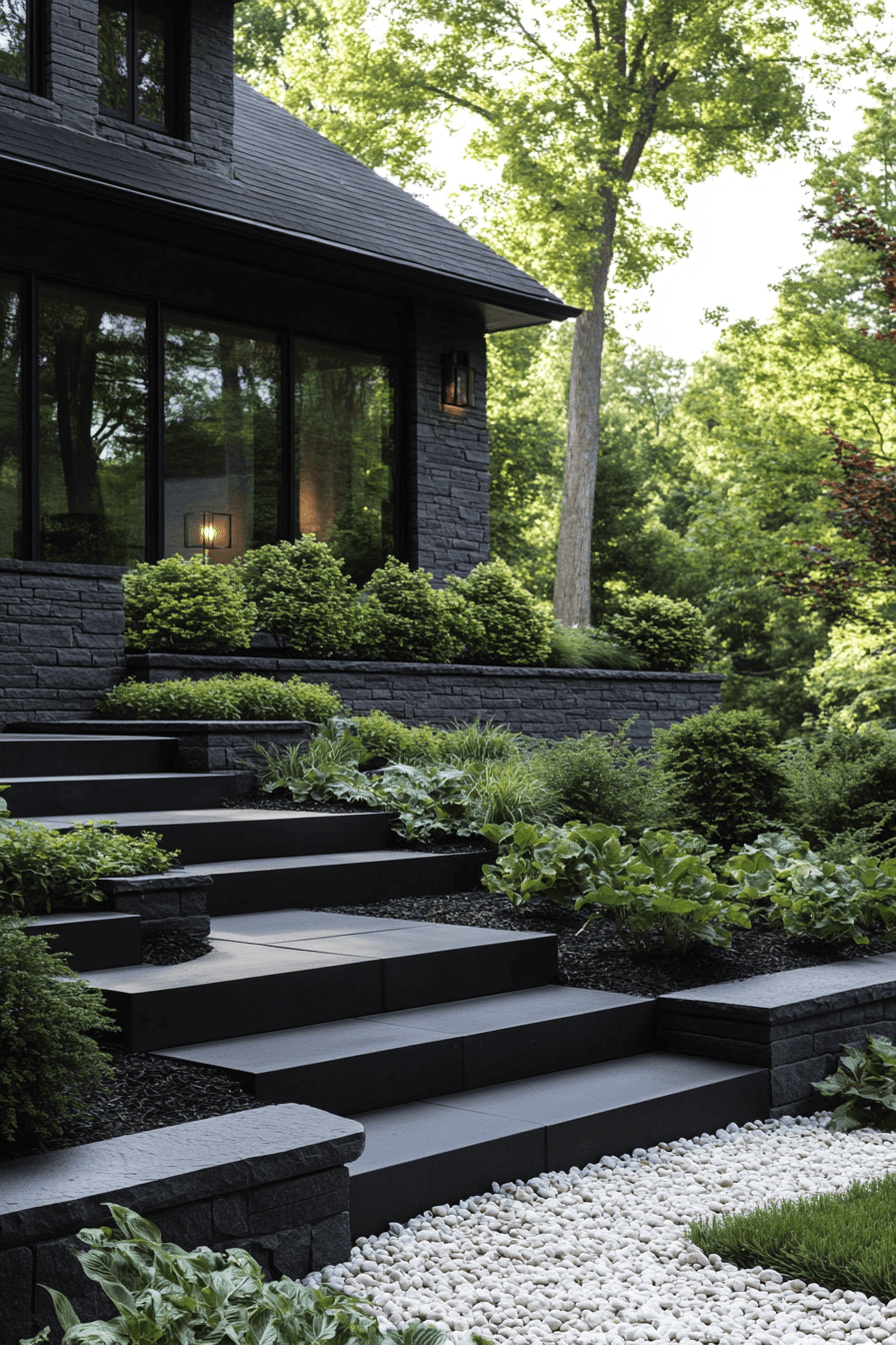 A bold monochrome look highlights how a modern front yard can feel dramatic and refined. Black and white tones create strong visual contrast. Clean lines keep the design balanced. The overall effect feels modern and timeless. It’s a striking yet simple choice. Create contrast with more modern front yard outdoor balcony ideas.