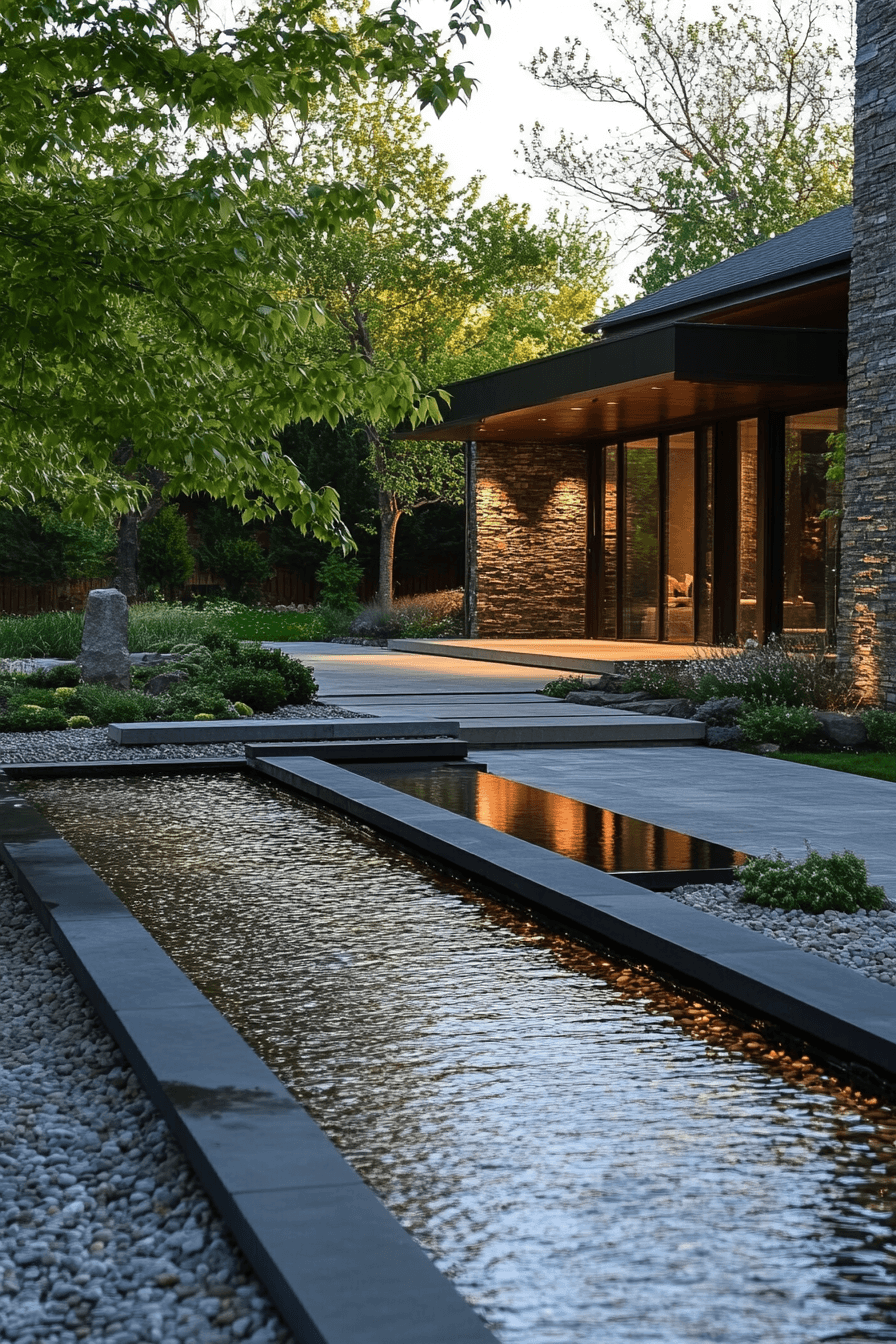 A sleek water feature shows how a modern front yard can introduce movement and elegance. Reflective surfaces and simple fountains create a focal point. The sound of water adds a calming element. Clean lines keep the feature modern. It enhances both style and atmosphere. Elevate your design with more modern front yard outdoor balcony ideas.