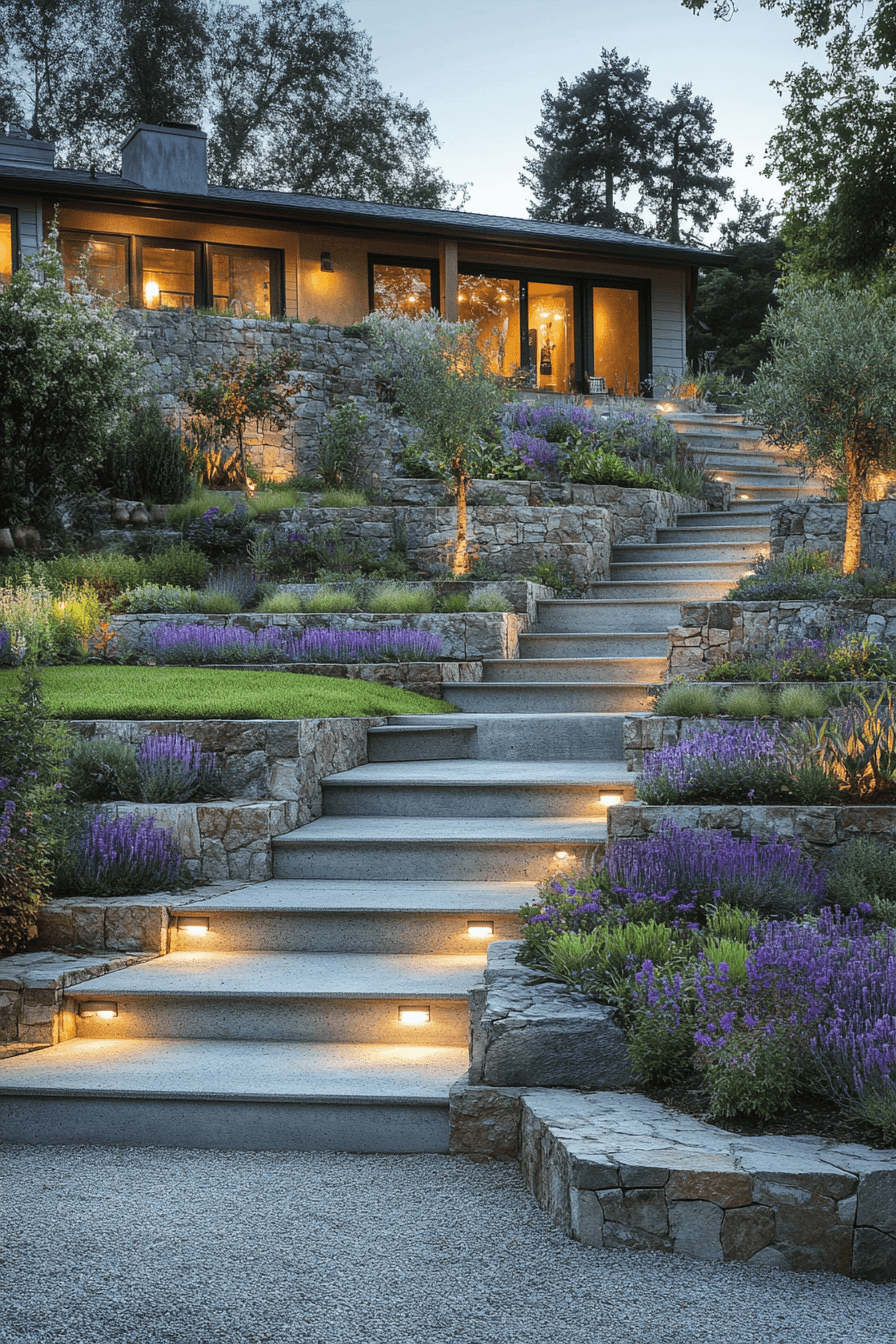 Tiered landscaping reveals how a modern front yard can create depth and dimension. Raised sections add visual interest without overcrowding. Clean materials keep everything structured. This approach works well on uneven terrain. The result feels architectural and bold. Add dimension with more modern front yard outdoor balcony ideas.