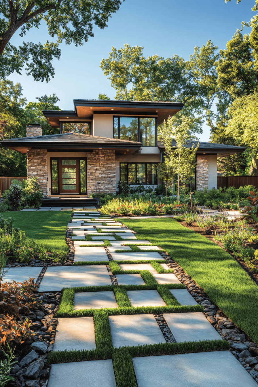 Wide stone paths demonstrate how a modern front yard can feel grounded and elegant. Large pavers create smooth transitions across the space. The texture adds subtle interest. Combined with gravel or turf, the layout feels cohesive. It’s both functional and stylish. Upgrade your pathways with more modern front yard outdoor balcony ideas.