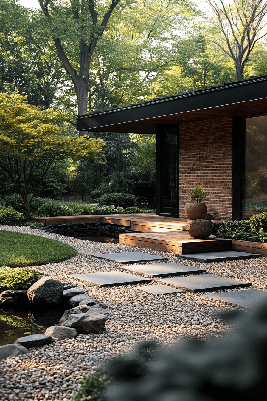 A tranquil zen layout reveals how a modern front yard can promote calm and simplicity. Clean gravel areas and smooth stones create a peaceful setting. Minimal details keep everything intentional. The design invites relaxation from the moment you arrive. It’s a serene yet striking style. Bring peaceful energy with more modern front yard outdoor balcony ideas.