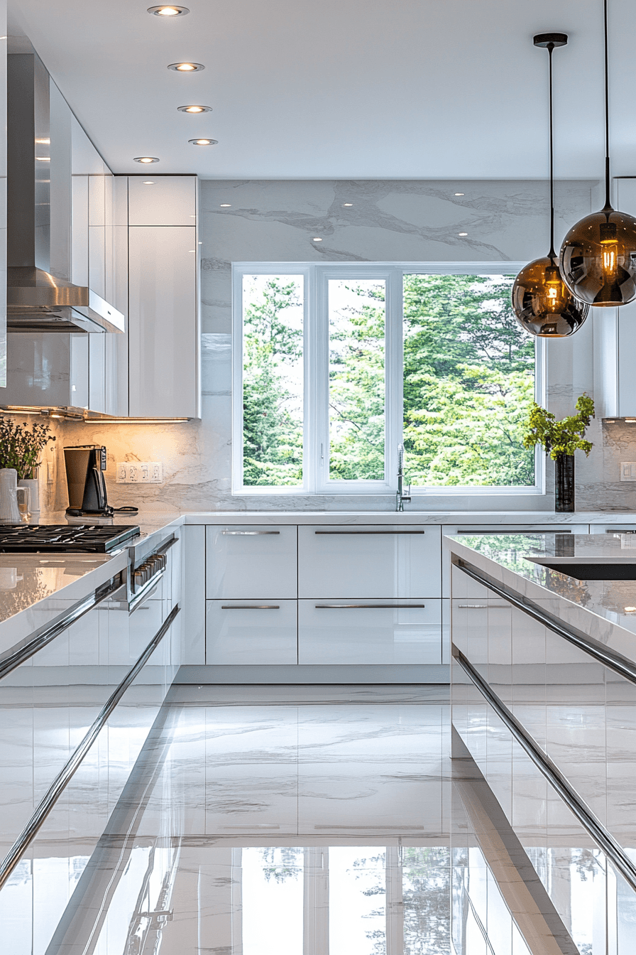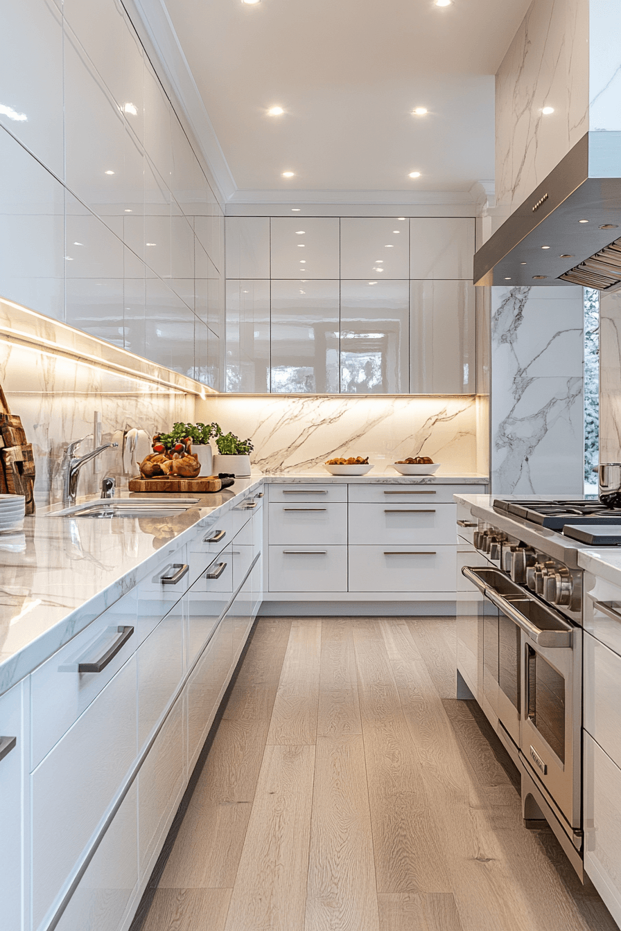 Bright white reflective cabinetry continues to shape modern kitchen cabinet design by maximizing light and creating a fresh, open environment that feels timeless. Gloss finishes amplify brightness effectively. Metallic accents add subtle contrast. Smooth lines maintain clarity. The space feels clean and expansive. Explore more white cabinet inspiration.
