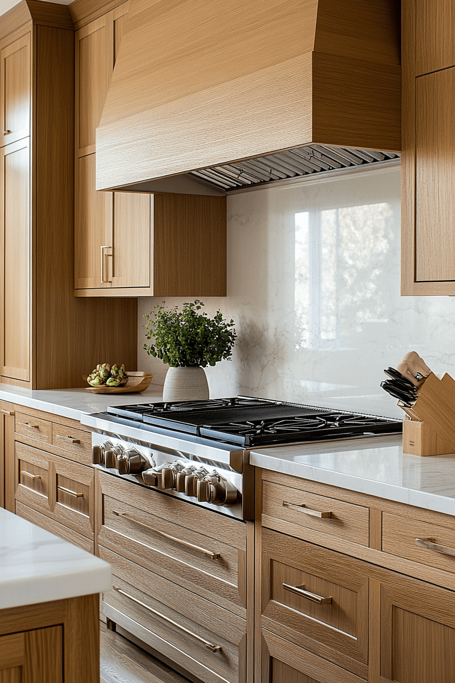 Natural wood textures enrich modern kitchen cabinet design by introducing warmth while maintaining a clean and contemporary look. Smooth veneers provide subtle grain detail without feeling heavy. Neutral countertops balance the warmth effectively. Linear grain patterns add visual interest. The result blends natural and modern elements seamlessly. Discover more wood cabinet inspiration.