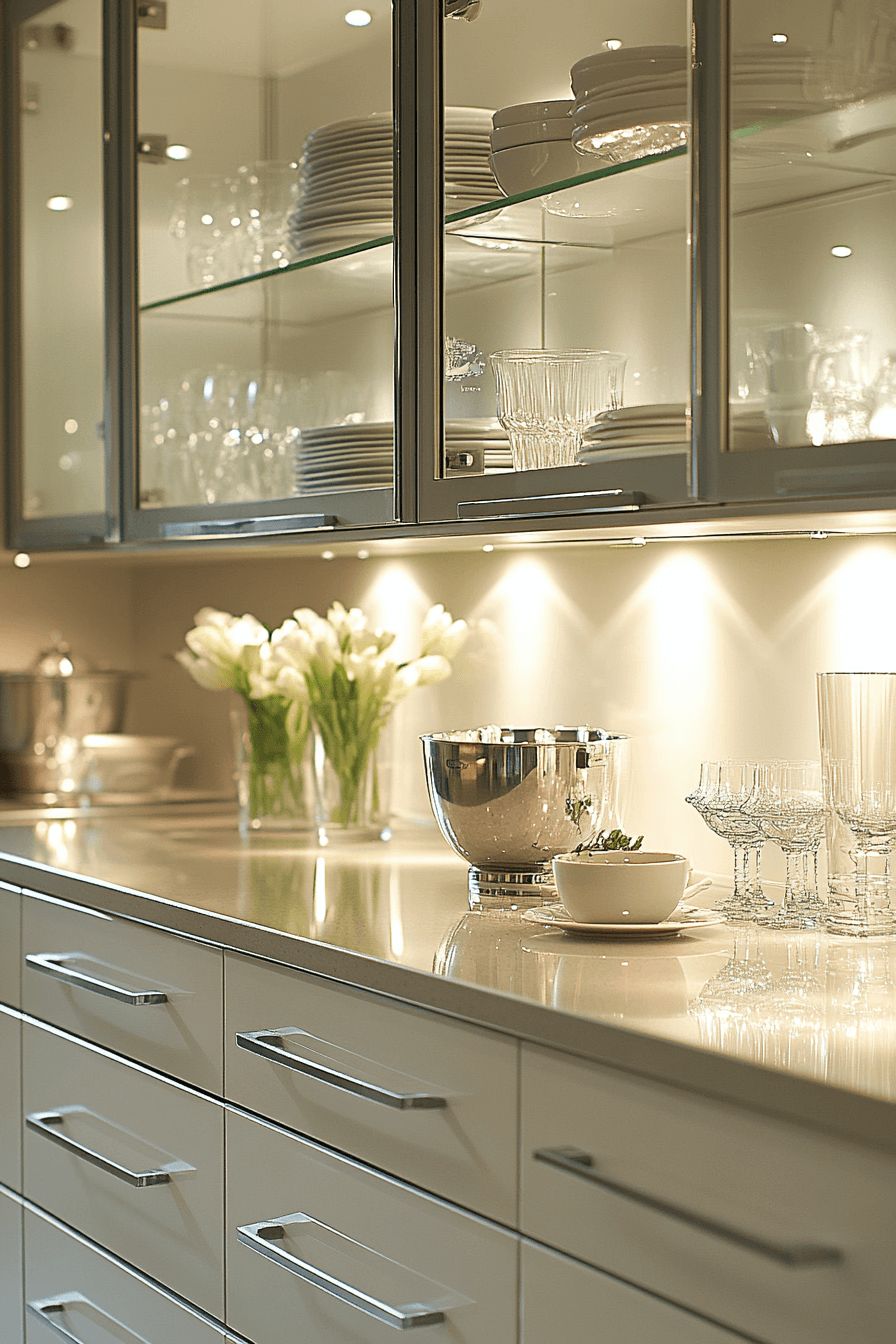 Soft metallic finishes introduce understated luxury into modern kitchen cabinet design by combining gentle shine with warm tones that feel refined and subtle. Champagne hues create a sophisticated glow. Neutral surroundings enhance the effect. Minimal detailing keeps the design modern. The result feels elegant without excess. Discover more metallic cabinet ideas.