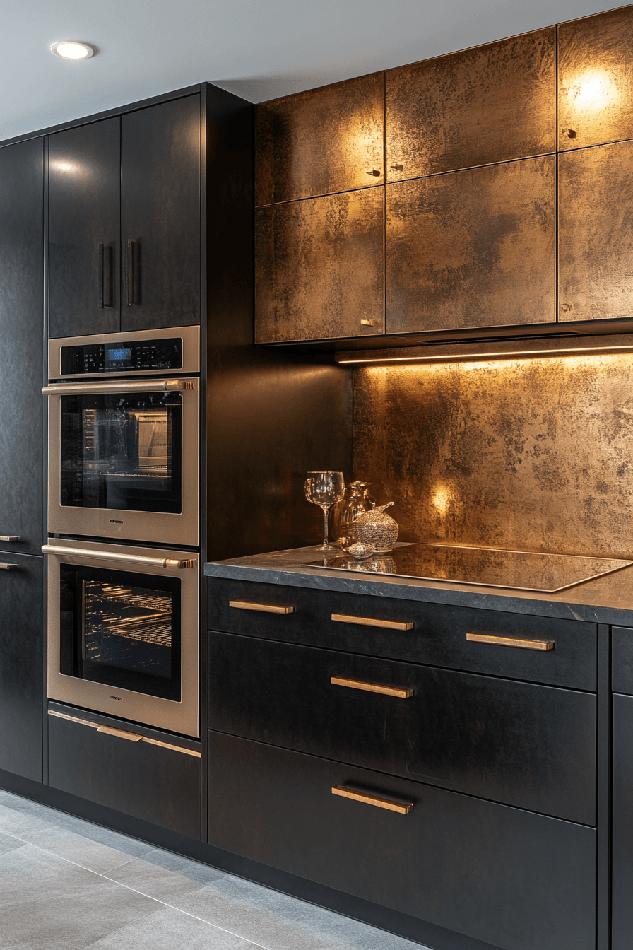 Metallic detailing enhances modern kitchen cabinet design by adding subtle shine that elevates the overall aesthetic without overwhelming the space. Gold, bronze, or chrome accents create focal points. Neutral cabinetry balances the metallic effect. Lighting enhances the reflective qualities. The result feels refined and modern. Discover more metallic cabinet ideas.