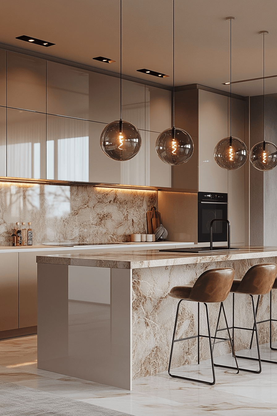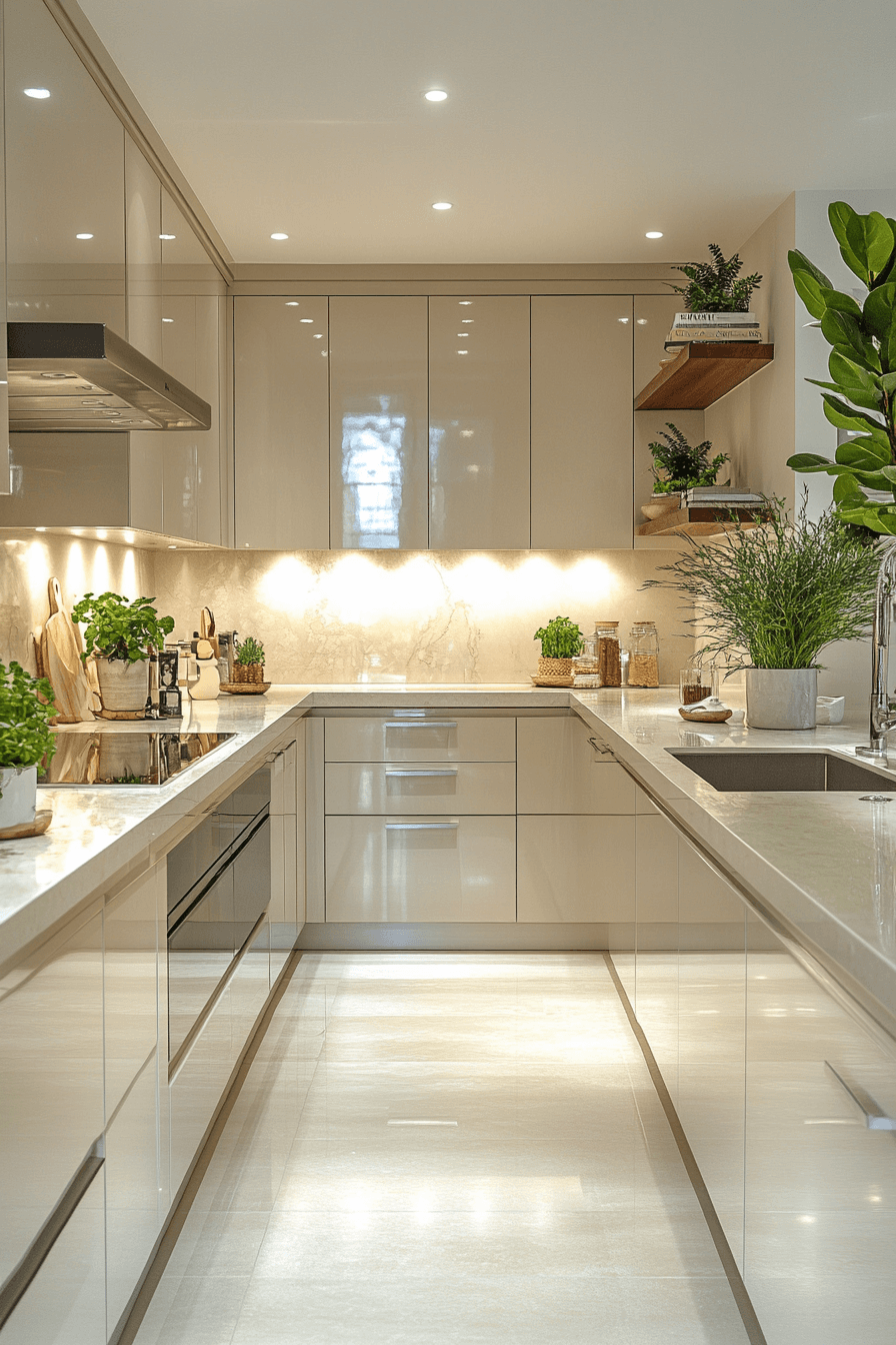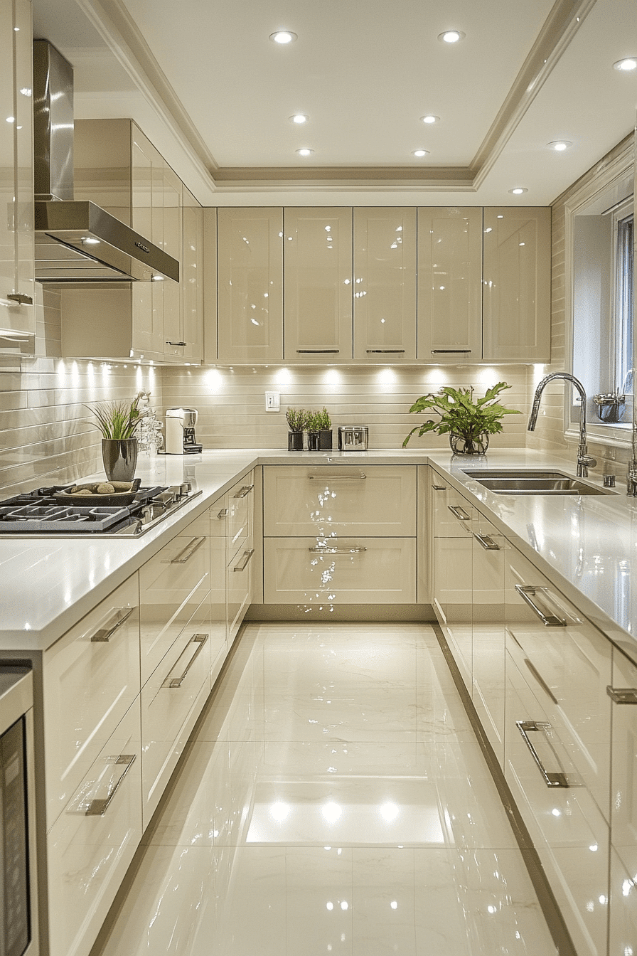 Glossy neutral tones enhance modern kitchen cabinet design by combining reflective finishes with soft colors that create balance and brightness throughout the space. Light shades amplify illumination. Minimal hardware maintains cohesion. The design feels polished and inviting. Lighting enhances the effect. Explore more glossy neutral cabinet ideas.