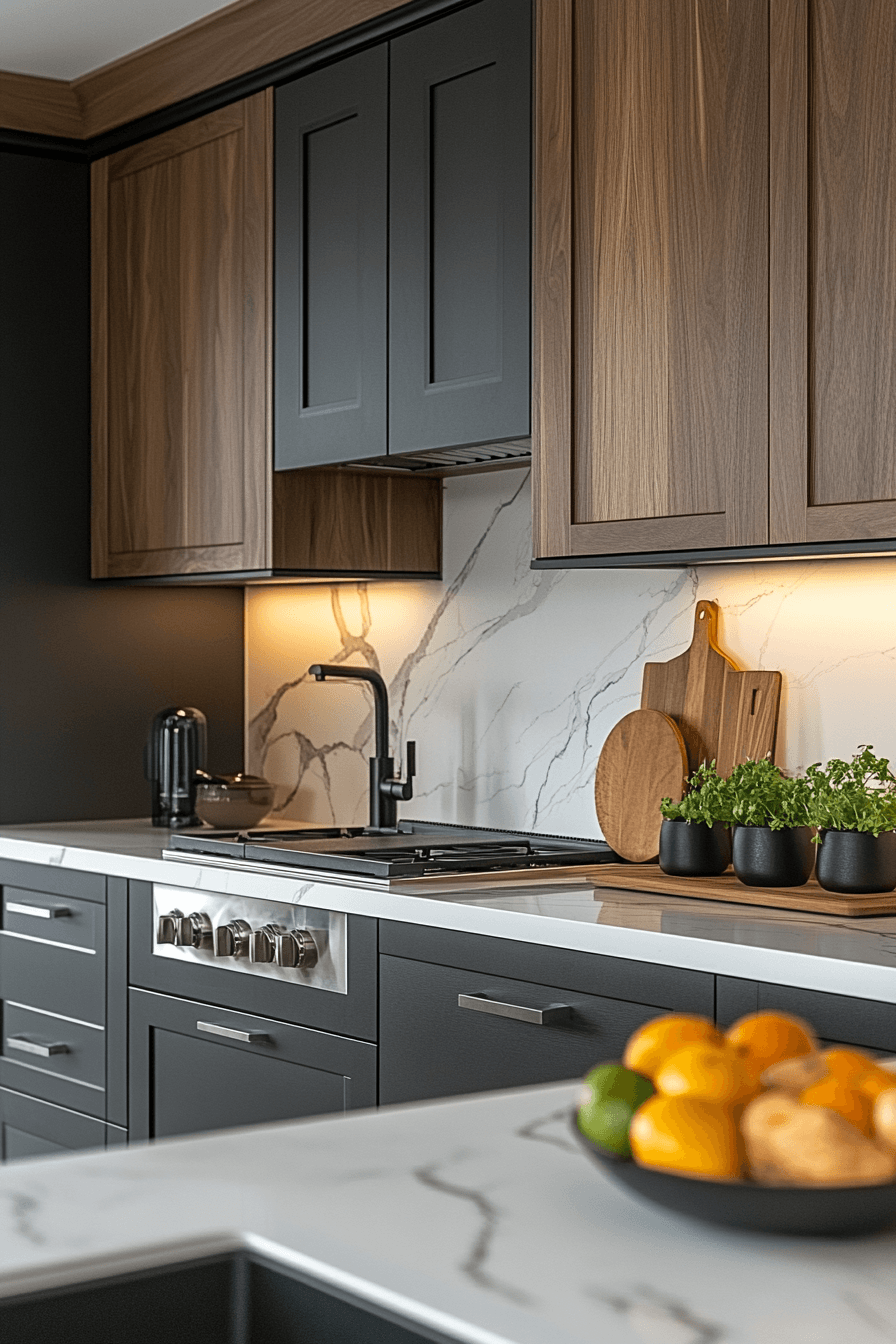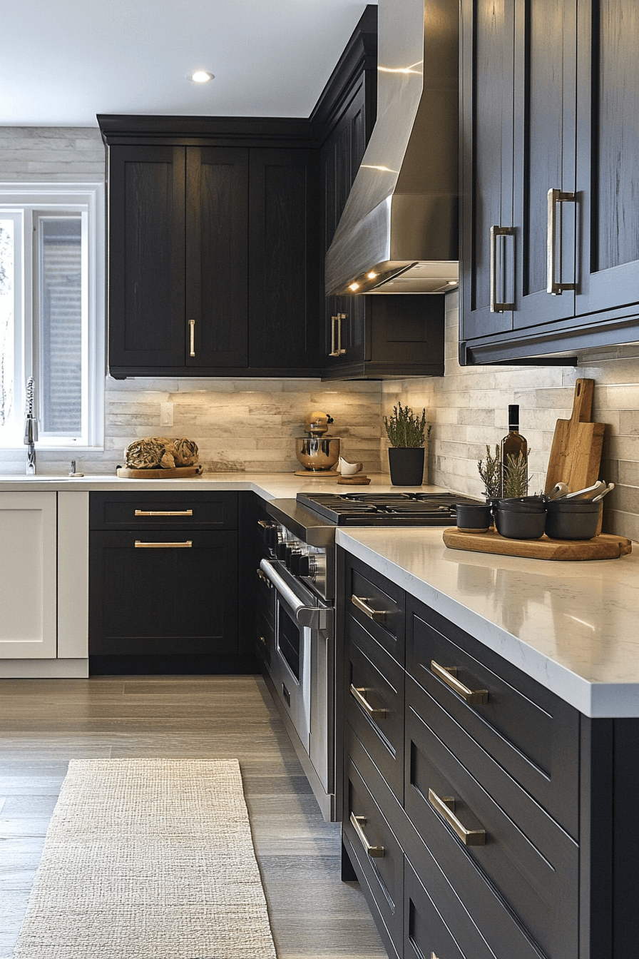 Contrasting light and dark elements define modern kitchen cabinet design by creating strong visual depth that feels both bold and structured. Clean lines maintain balance across the layout. Lighting enhances the contrast effectively. Neutral accents unify the design. The result feels timeless and striking. Explore more contrast cabinet inspiration.