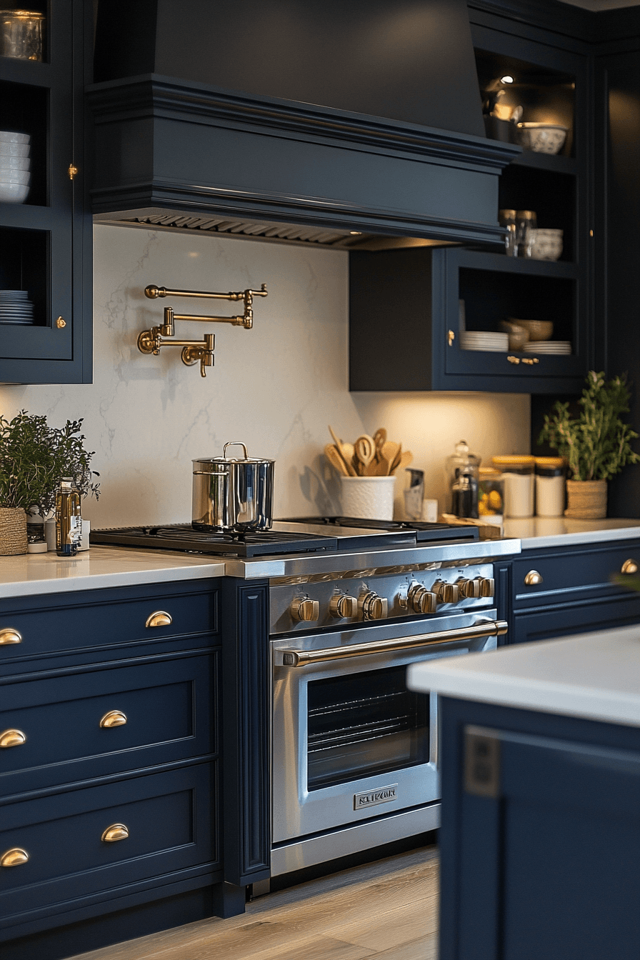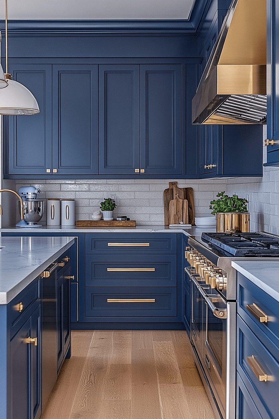 Deep navy cabinetry strengthens modern kitchen cabinet design by introducing bold color with a refined structure that feels both dramatic and controlled. Metallic accents enhance the richness of the tone. Clean lines maintain clarity. Neutral surfaces balance intensity. The result feels elegant and modern. Explore more navy cabinet inspiration.