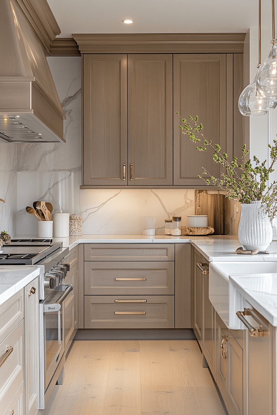 Warm taupe finishes support modern kitchen cabinet design by blending soft warmth with contemporary simplicity for a balanced and elegant look. The tone adapts easily across styles. Clean lines maintain structure. Metallic accents enhance subtle depth. The result feels calm and refined. Discover more taupe cabinet ideas.