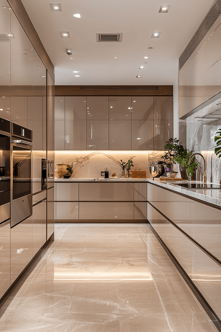 High-shine neutral cabinetry enhances modern kitchen cabinet design by combining calming tones with reflective finishes that expand the sense of light and space. Soft shades such as taupe and gray create a balanced backdrop. Gloss finishes elevate the overall polish. Metallic fixtures complement the surfaces seamlessly. The result feels refined and timeless. Discover more glossy neutral cabinet ideas.