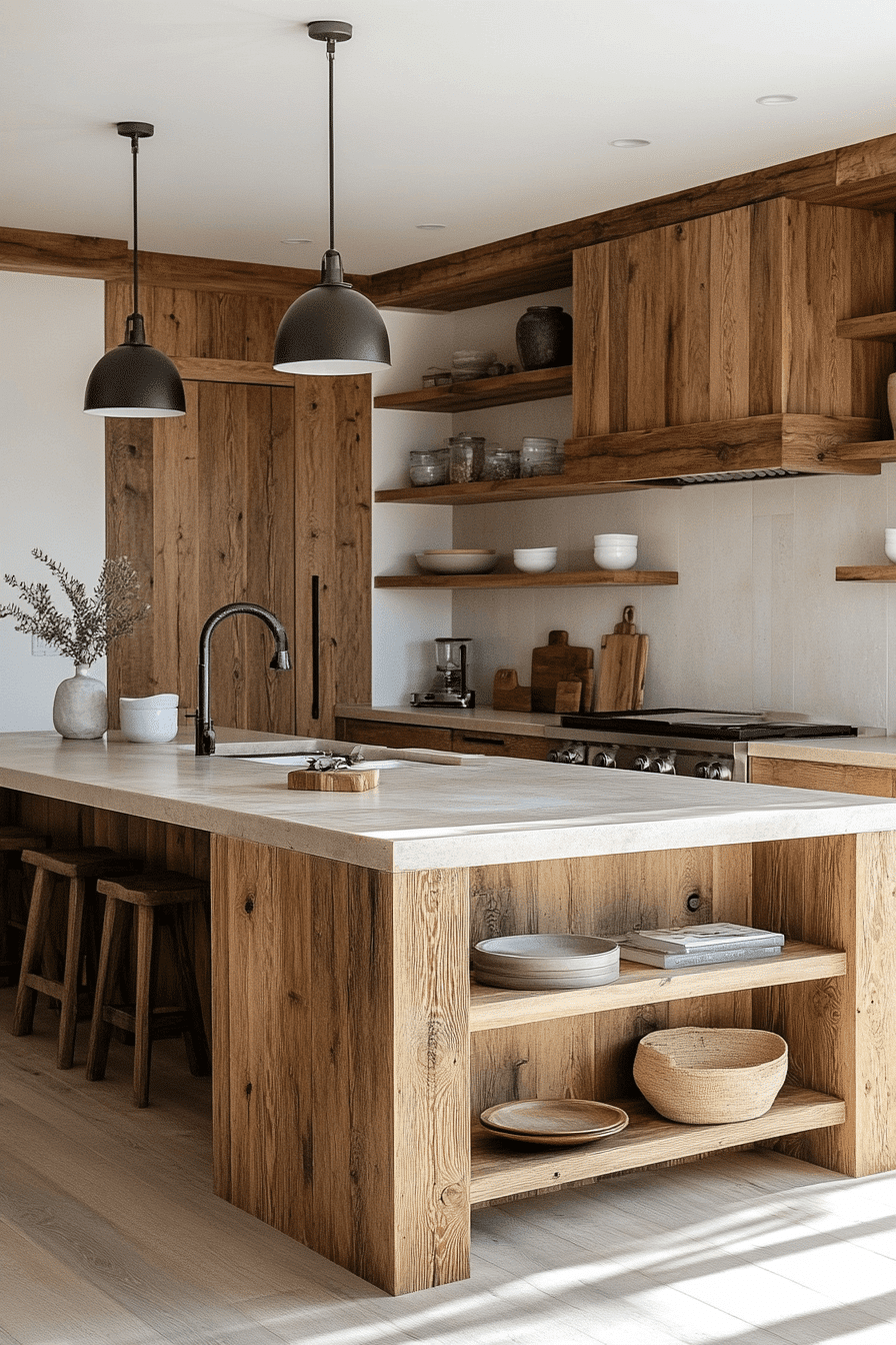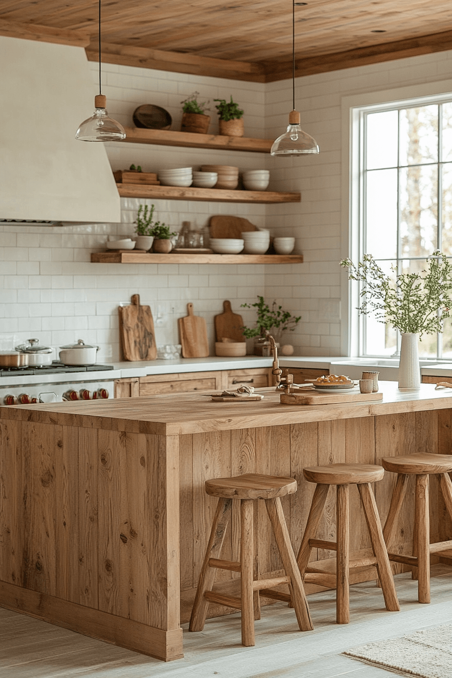 A serene foundation is established when pine kitchen cabinets anchor a design rooted in simplicity. The soft wood tone allows the space to feel open and breathable. Open shelving and light backsplashes enhance visual calm. Minimal hardware preserves clarity. The result feels thoughtful and intentional.