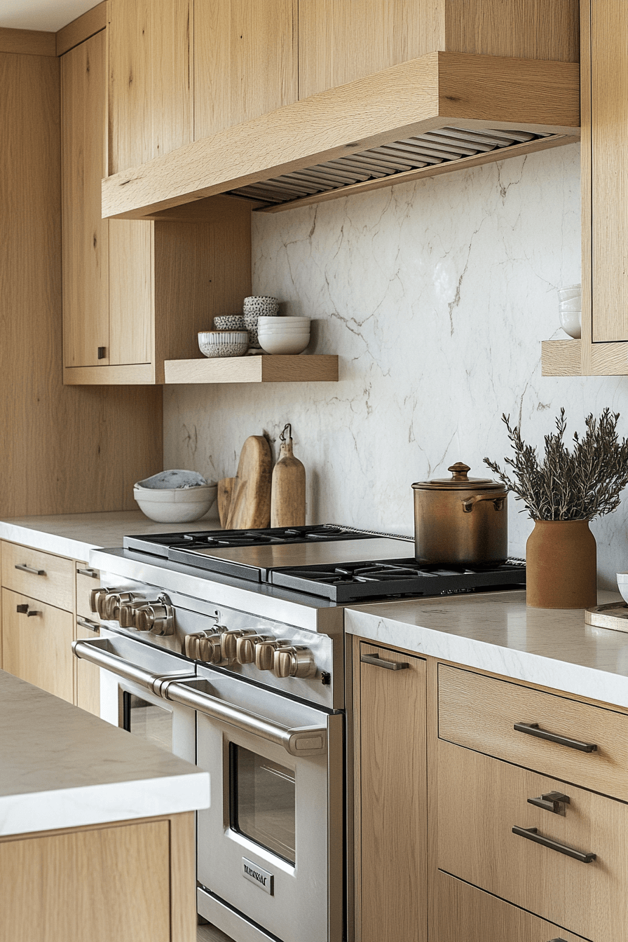 A gentle timber-inspired brightness spreads throughout the space when pine kitchen cabinets reflect light with their soft, natural sheen. Their warm undertone blends seamlessly with modern materials. Pine works equally well alongside cool and warm color palettes. Clean lines ensure the kitchen feels fresh and airy. The design remains lively without relying on contrast.