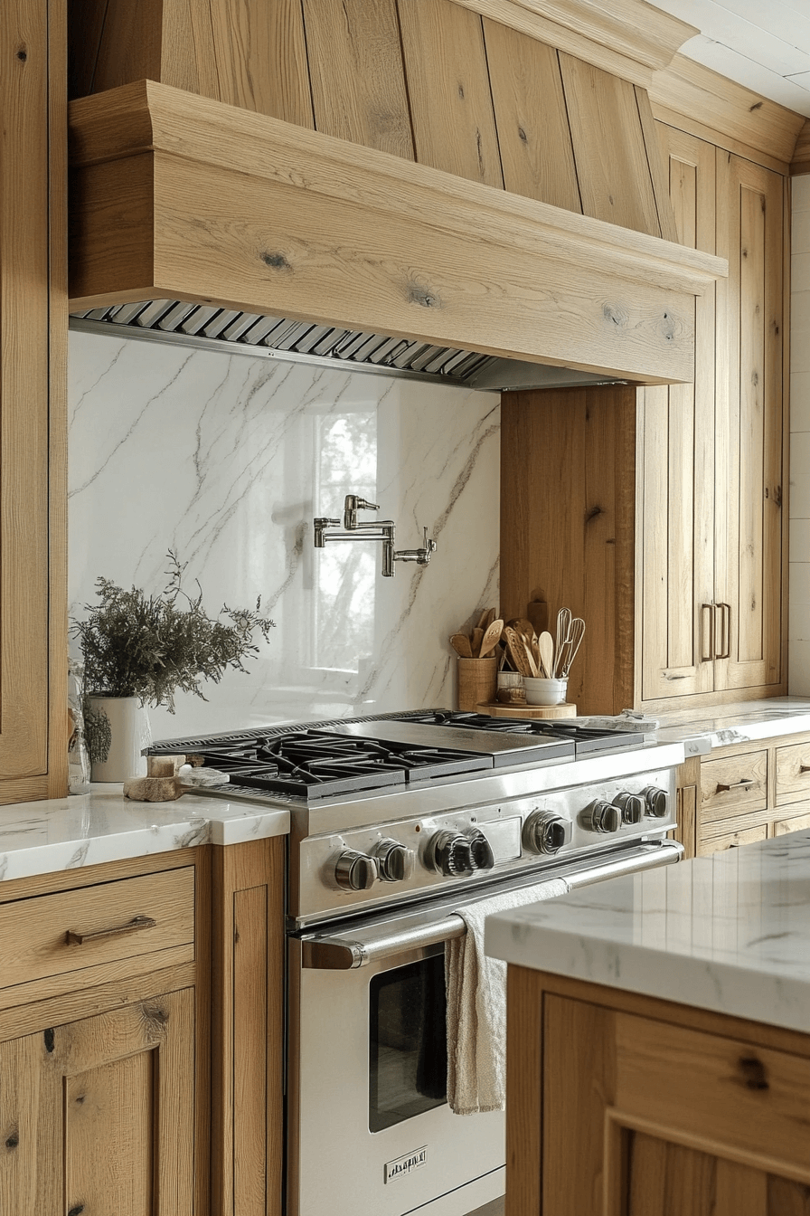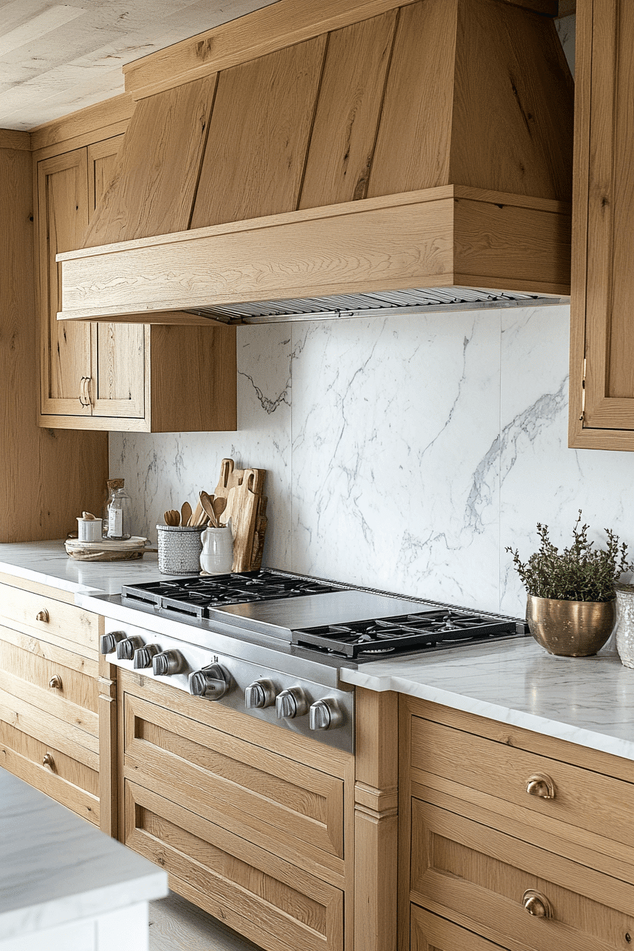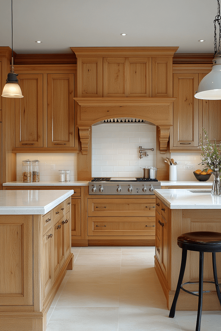 A honey-inspired warmth spreads through the space when pine kitchen cabinets feature a golden finish. This tone softens hard edges and adapts to many decor styles. The kitchen feels cheerful yet composed. Stone and marble accents add refinement. Pine offers warmth with elegance.