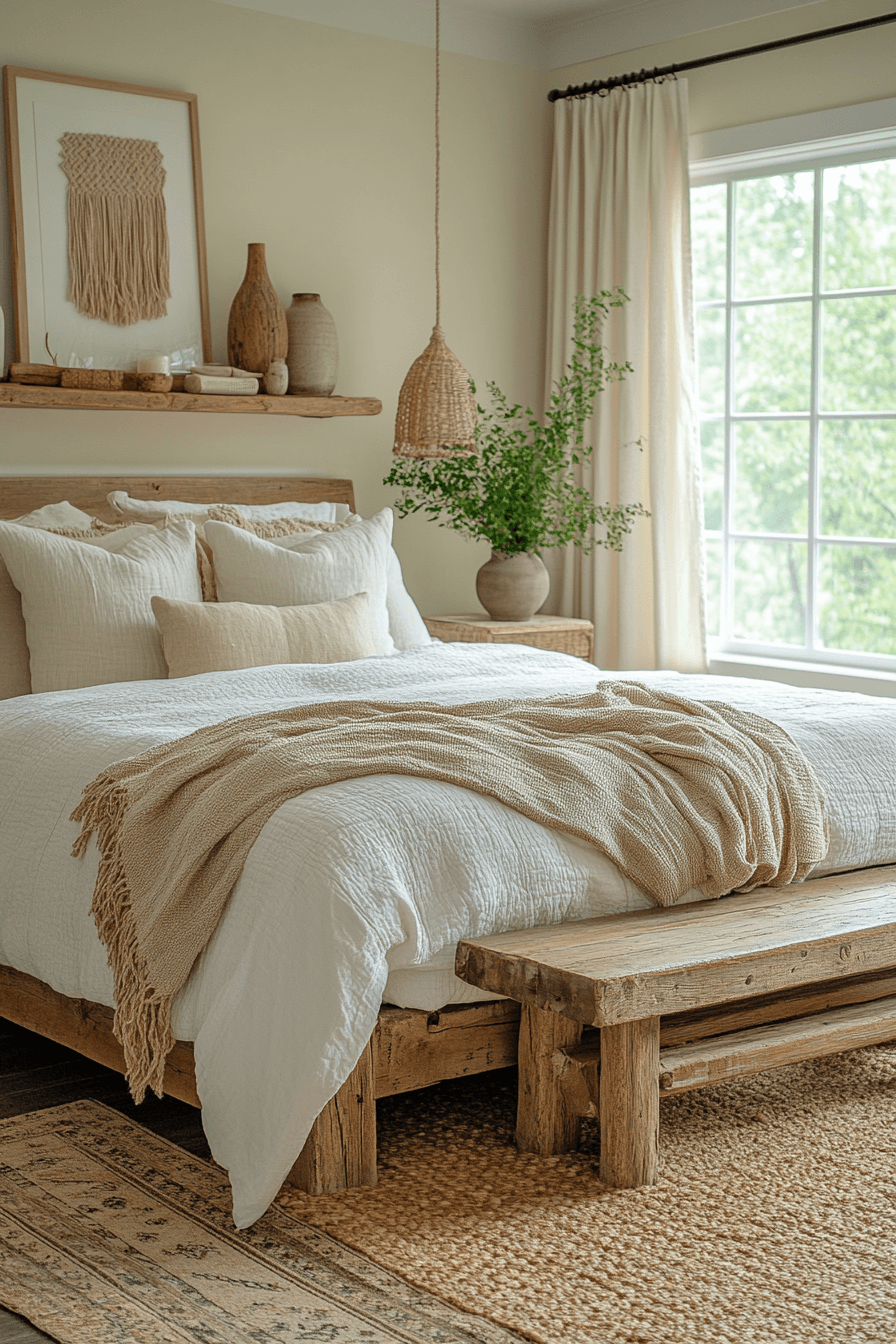 Neutral palettes create soothing rustic boho bedroom ideas filled with calm energy. Layers of white, beige, and grey fabrics keep the space soft and inviting. Natural light enhances the airy design. Light wood furniture complements the bohemian details. The bedroom becomes a tranquil sanctuary. Discover rustic boho bedroom ideas with serene neutral tones.