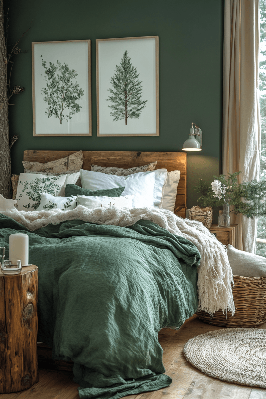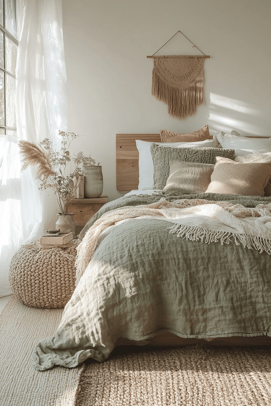 Soft green hues bring freshness to rustic boho bedroom ideas while keeping the space grounded. Sage tones pair beautifully with whitewashed wood and neutral bedding. Botanical prints and earthy ceramics reinforce the natural feel. Layered greens and beige tones create a spa-like atmosphere. The room feels calm and restorative. Explore rustic boho bedroom ideas with soft green accents.