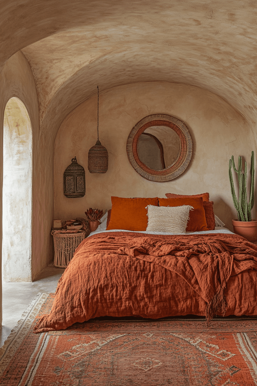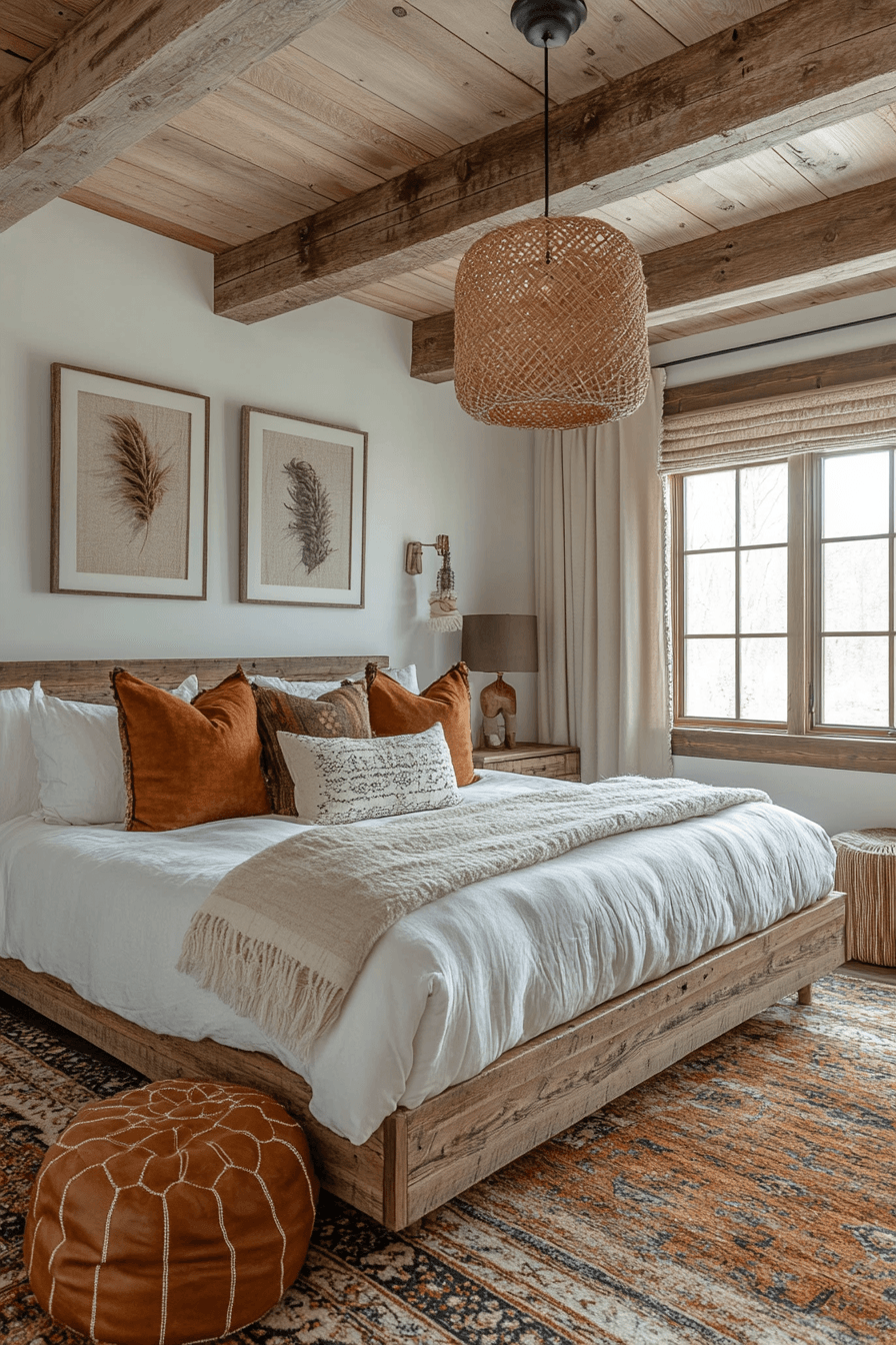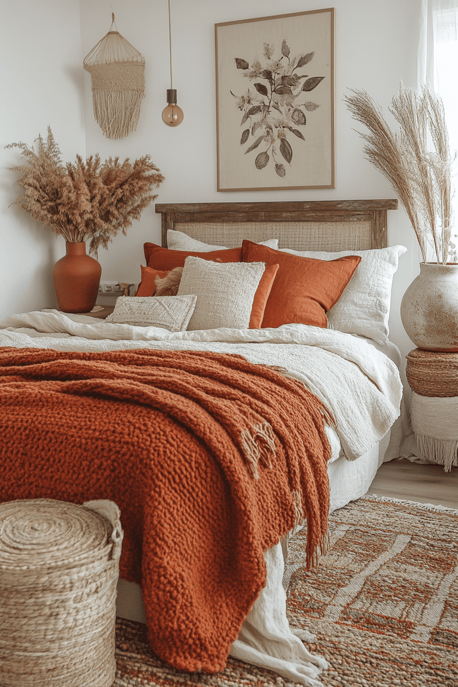 Rust-toned accents add warmth and energy to rustic boho bedroom ideas. Burnt orange pillows or throws create striking focal points. Paired with natural wood and woven textures, the color feels balanced and inviting. The earthy palette keeps the design cohesive. The bedroom feels lively yet grounded. Discover rustic boho bedroom ideas with bold earthy colors.
