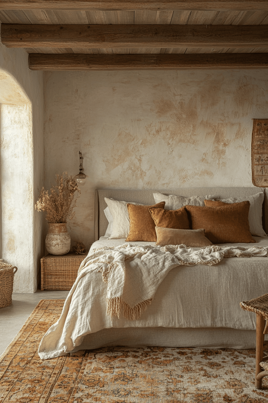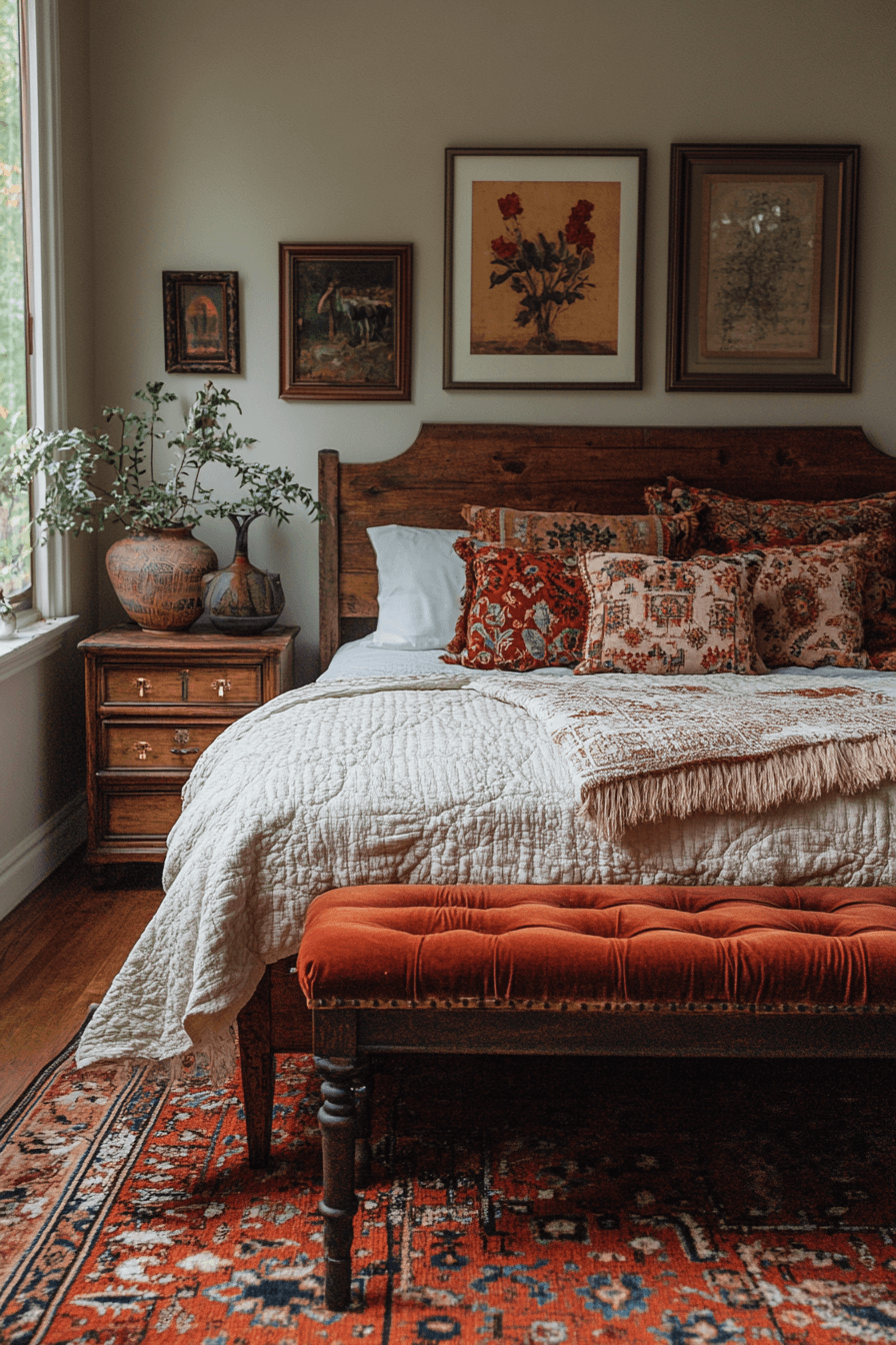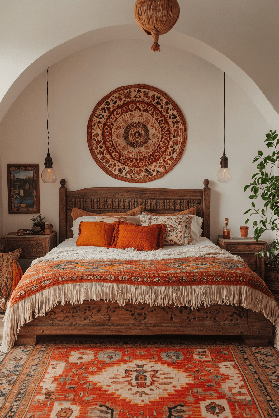 Rust-toned accents add warmth and energy to rustic boho bedroom ideas. Burnt orange pillows or throws create striking focal points. Paired with natural wood and woven textures, the color feels balanced and inviting. The earthy palette keeps the design cohesive. The bedroom feels lively yet grounded. Discover rustic boho bedroom ideas with bold earthy colors.