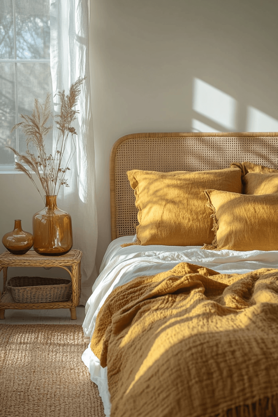 Golden tones bring warmth and brightness to rustic boho bedroom ideas. Amber accents, light wood furniture, and textured fabrics create a cozy glow. Pampas grass and woven cushions add gentle movement to the space. The warm palette feels welcoming without overpowering the room. The result is a bedroom full of natural comfort. Discover rustic boho bedroom ideas with golden earthy tones.