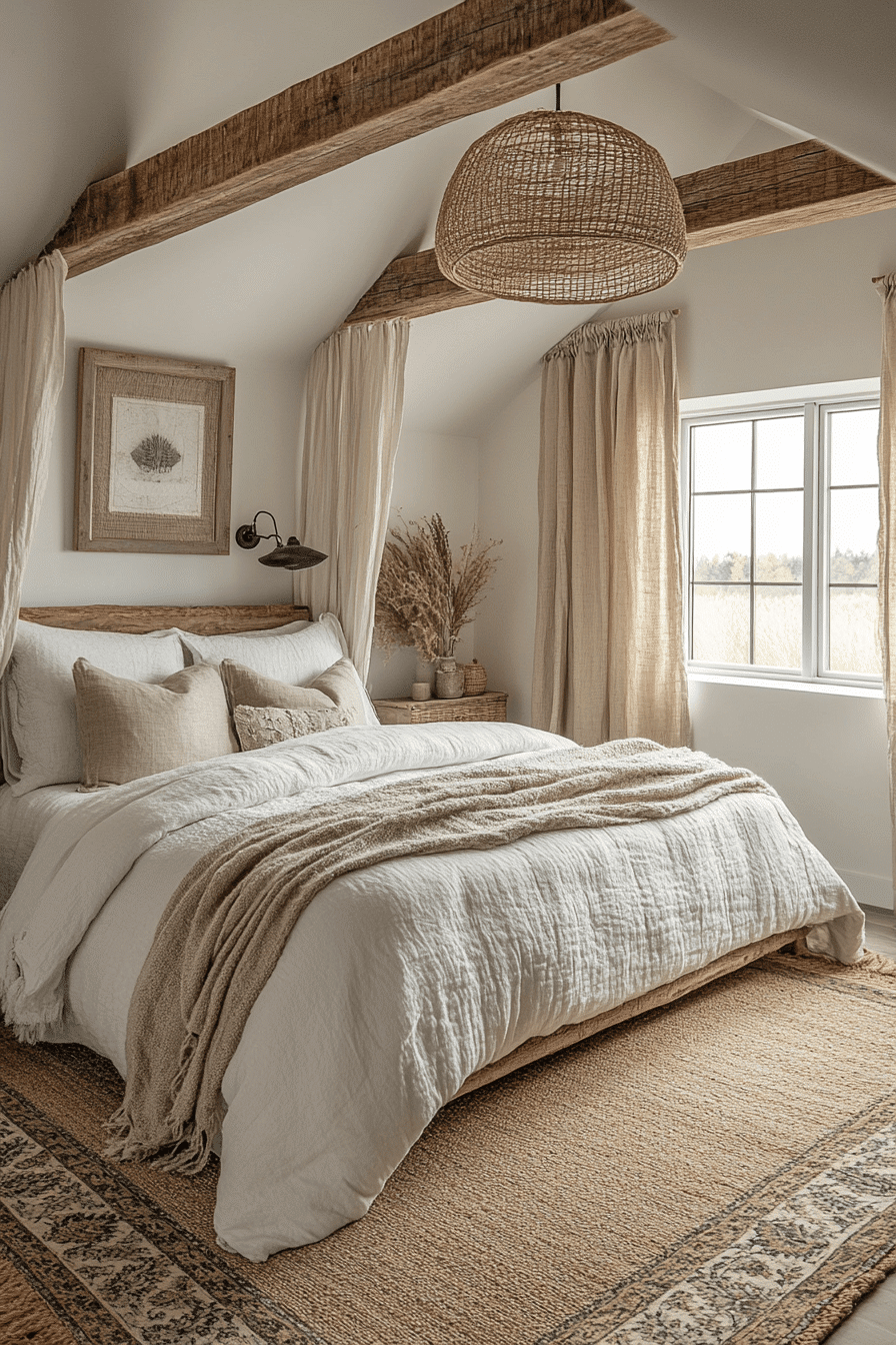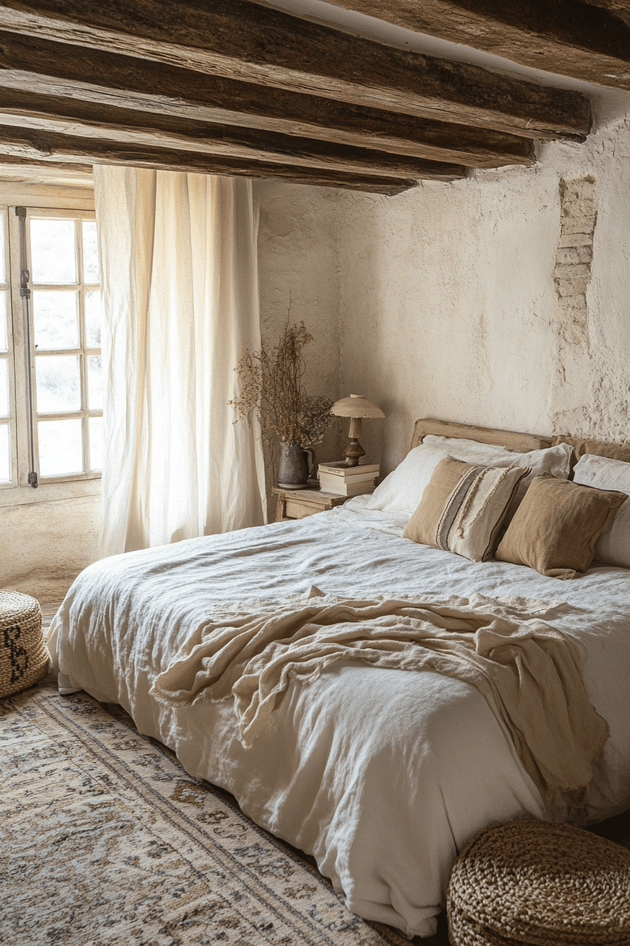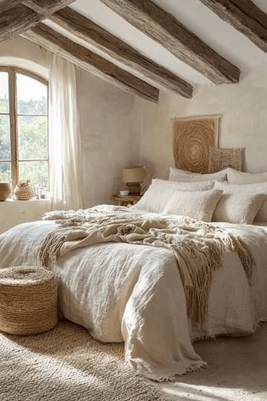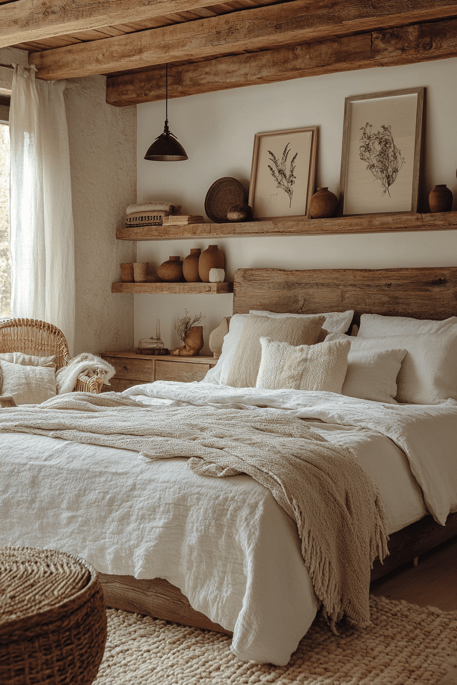 Architectural wood beams add character and structure to rustic boho bedroom ideas. These elements draw the eye upward and highlight the room’s natural materials. Airy fabrics soften the strong lines of the wood. Hanging chairs or woven lighting add playful bohemian touches. The design feels both rustic and artistic. Explore rustic boho bedroom ideas that feature exposed beams.