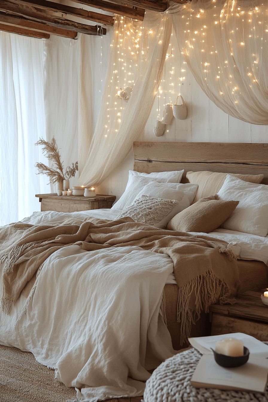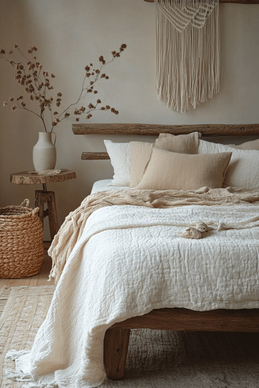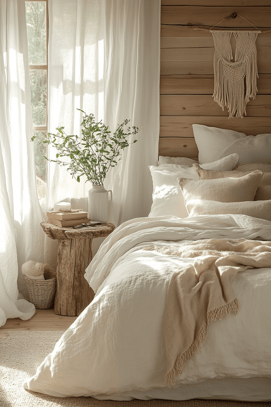 Linen layers add effortless elegance to rustic boho bedroom ideas. Mixing shades of ivory, taupe, and blush creates subtle dimension. Linen bedding pairs beautifully with distressed wood furniture. The relaxed fabric texture keeps the room feeling cozy. The look is both casual and refined. Browse rustic boho bedroom ideas styled with linen layers.