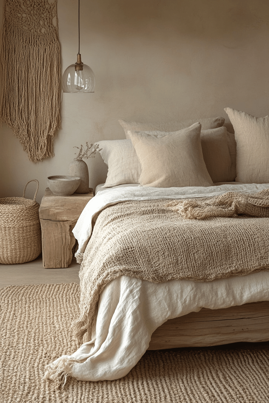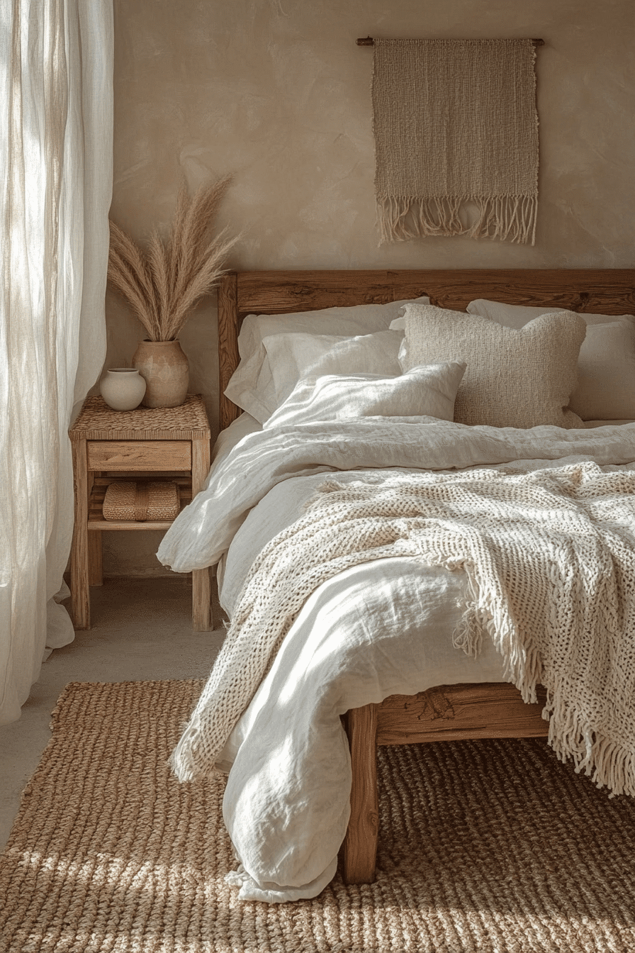 Sandy shades help create calm rustic boho bedroom ideas with effortless style. Airy linens, light wood furniture, and simple decor keep the room feeling open. Macramé wall art or jute rugs add texture to the neutral palette. These details maintain warmth while preserving simplicity. The bedroom feels serene and relaxed. Find rustic boho bedroom ideas inspired by desert dunes.