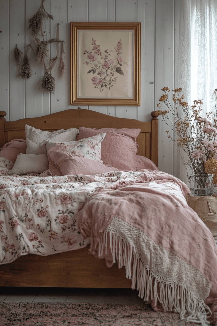 Soft floral accents can add delicate charm to rustic boho bedroom ideas. Dusty rose bedding or faded botanical prints introduce subtle color. Reclaimed wood furniture balances the gentle palette. Blush-toned ceramics or artwork enhance the romantic feel. The bedroom remains airy and peaceful. Find rustic boho bedroom ideas with floral inspiration.