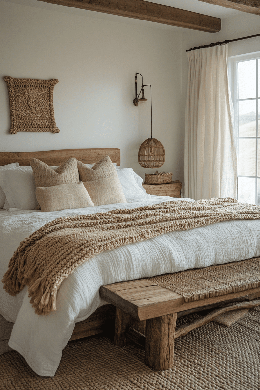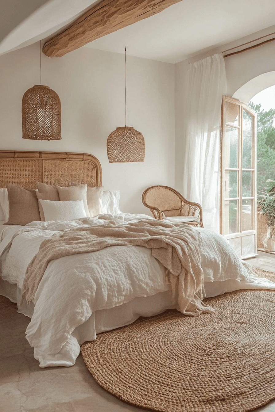 Rattan and wicker textures introduce breezy style to rustic boho bedroom ideas. Wicker headboards, woven baskets, and pendant lights create natural depth. White walls and weathered wood add contrast. The materials keep the room feeling light and breathable. The space feels relaxed and airy. Explore rustic boho bedroom ideas with woven wicker details.