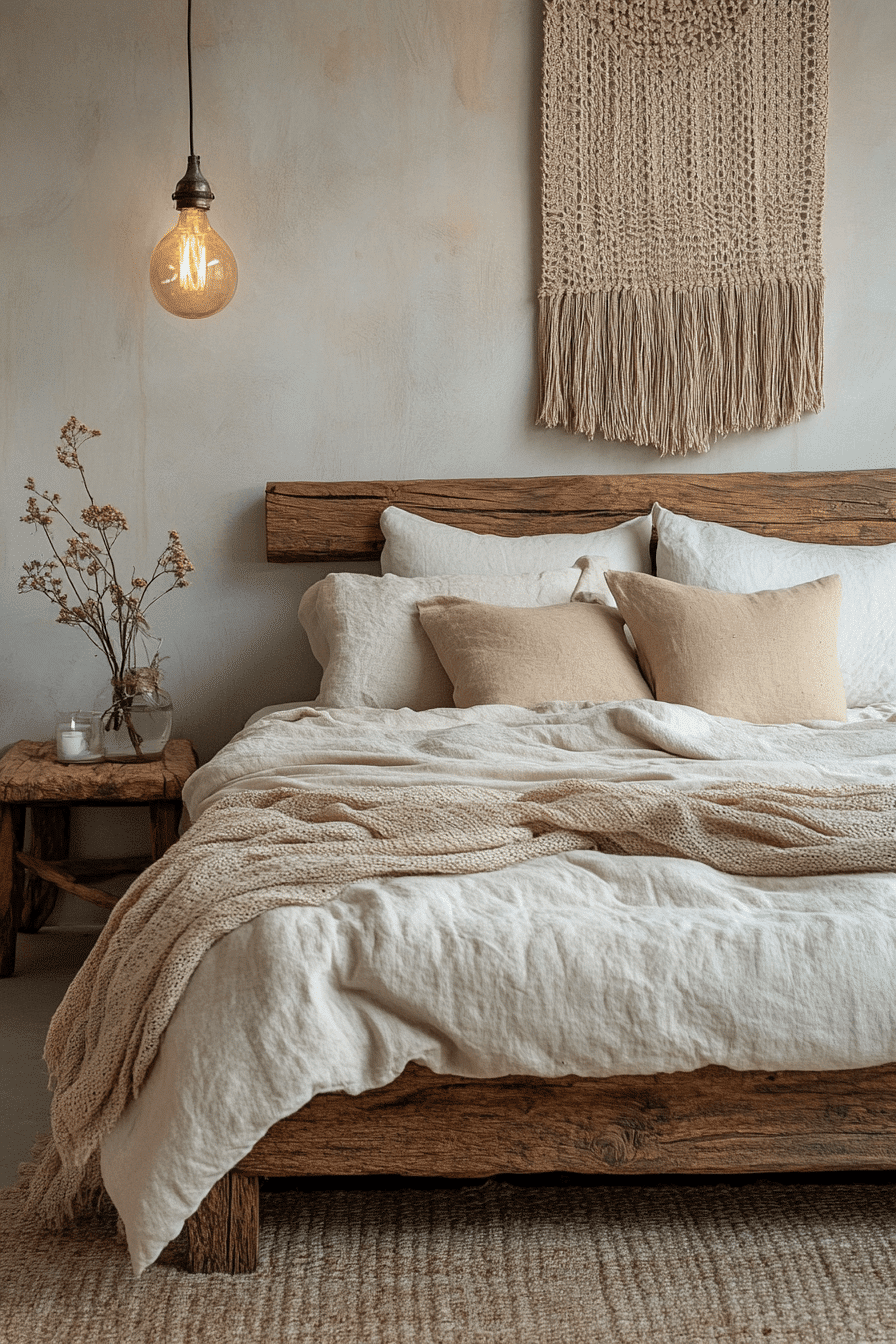 Light wood finishes help soften rustic boho bedroom ideas while maintaining warmth. Natural grain furniture pairs perfectly with neutral bedding and macramé decor. The understated tones keep the room feeling open and organic. Minimal styling allows the textures to stand out. The design feels simple yet inviting. Explore rustic boho bedroom ideas with gentle wood tones.