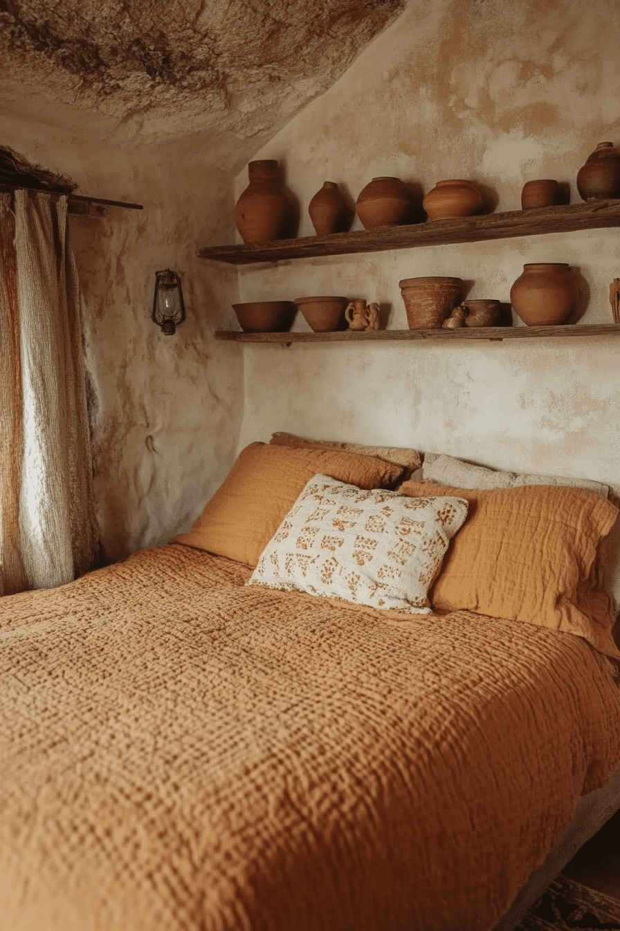 Terracotta shades add warmth and grounding energy to rustic boho bedroom ideas. Clay pottery, textured walls, and earthy textiles enhance the natural palette. These elements pair effortlessly with wood furniture. The room feels welcoming and handcrafted. The atmosphere remains relaxed and organic. Browse rustic boho bedroom ideas featuring terracotta accents.